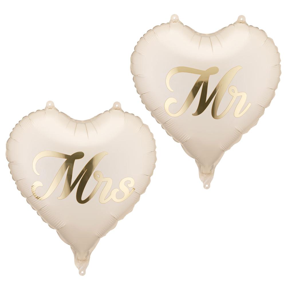 Mr & Mrs Folioilmapallot Sydän 2 kpl sisältää setin, jossa on kaksi sydämenmuotoista ilmapalloa mattabeigen värisinä. Molemmissa ilmapalloissa on kiiltävän kullanvärinen teksti, toisessa lukee 'Mr' ja toisessa 'Mrs'. Ne voidaan täyttää ilmalla tai heliumilla, ja mukana toimitetaan pilli täyttämistä varten.