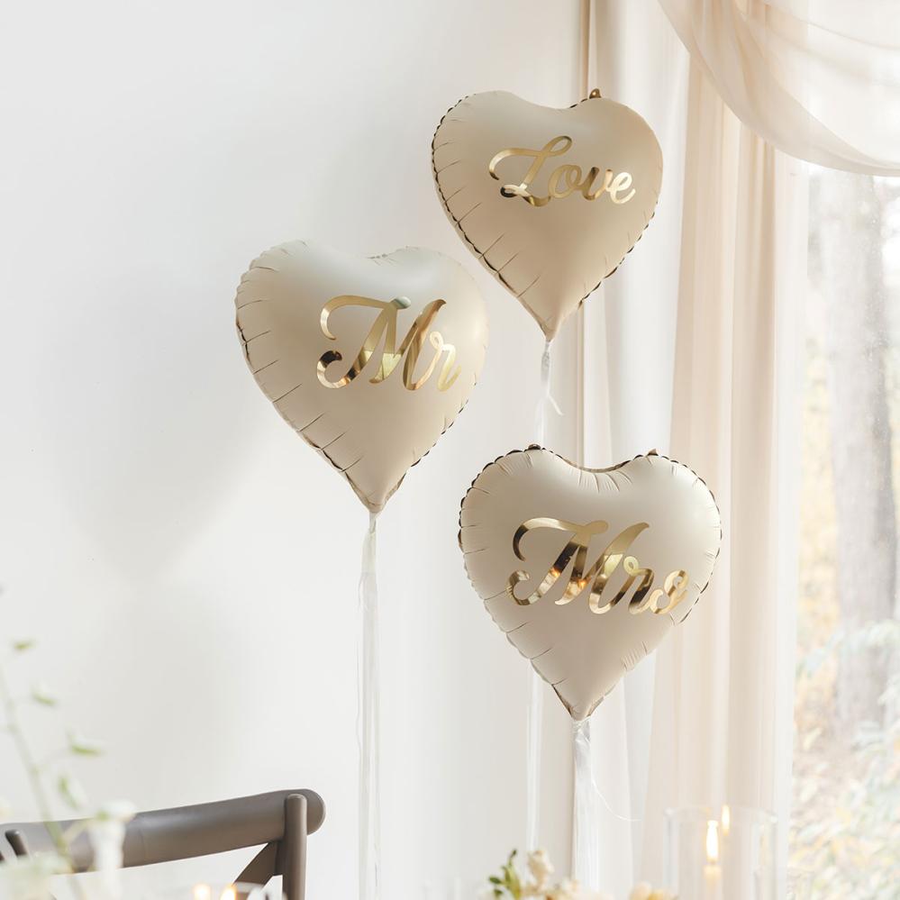 Hääilmapallojen ja sydänilmapallojen joukossa tekstit Mr ja Mrs omissa ilmapalloissaan ovat leikkisä yksityiskohta, ja nämä sydämenmuotoiset ilmapallot sopivat hyvin sekä häihin että kihlaustilaisuuteen.
