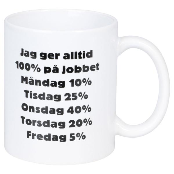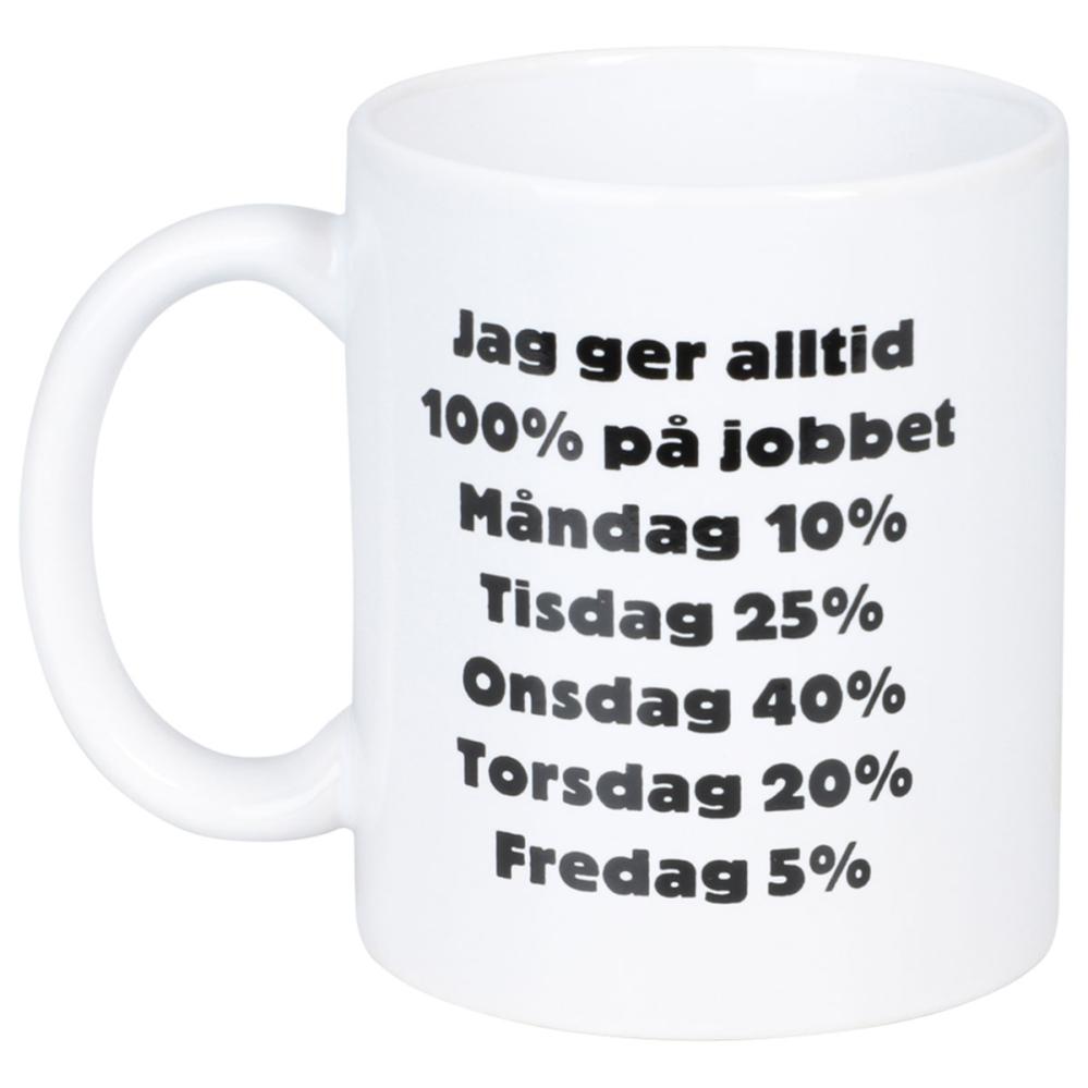 Muki 100% På Jobbet 300 ml on valkoinen posliinimuki, jonka molemmille puolille on painettu musta teksti: "Annan aina 100 % työssäni – Maanantai 10 %, Tiistai 25 %, Keskiviikko 40 %, Torstai 20 %, Perjantai 5 %".