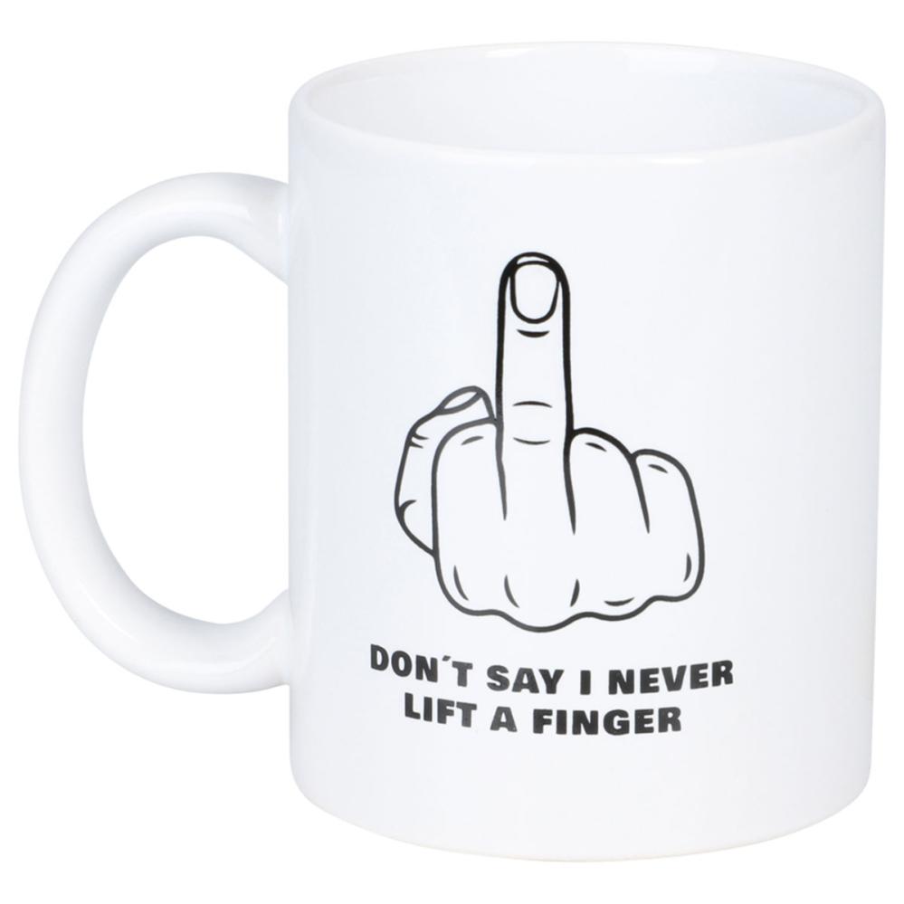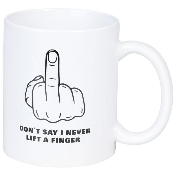 Muki Don't Say I Never Lift A Finger 300 ml on valkoinen posliinimuki, jossa on musta painatus molemmilla puolilla, ja sitä koristaa humoristinen kuvitus kädestä, joka näyttää keskisormea, sekä sen alla teksti "Don't say I never lift a finger".
