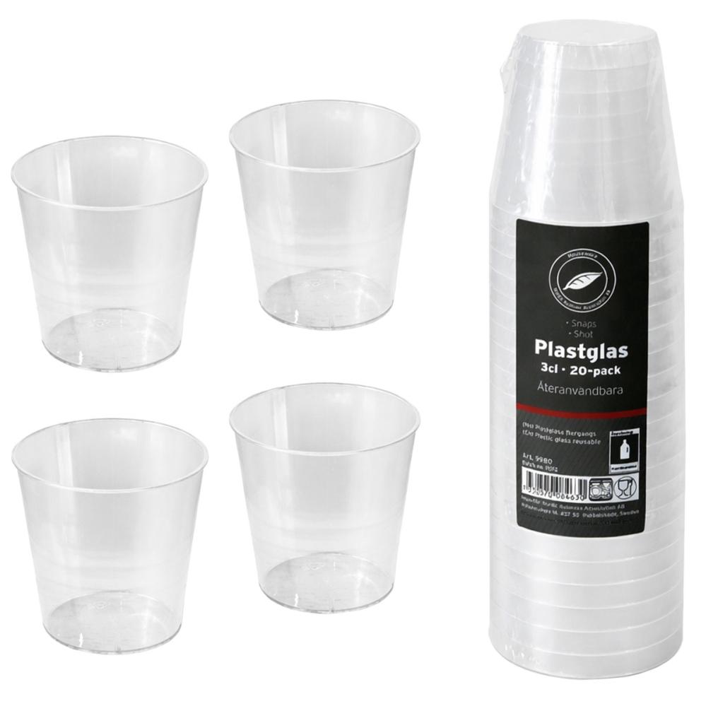 Muoviset Snapsilasit 3 cl 20 kpl sisältää kaksikymmentä läpinäkyvää snapsilasia, jotka ovat uudelleenkäytettäviä.