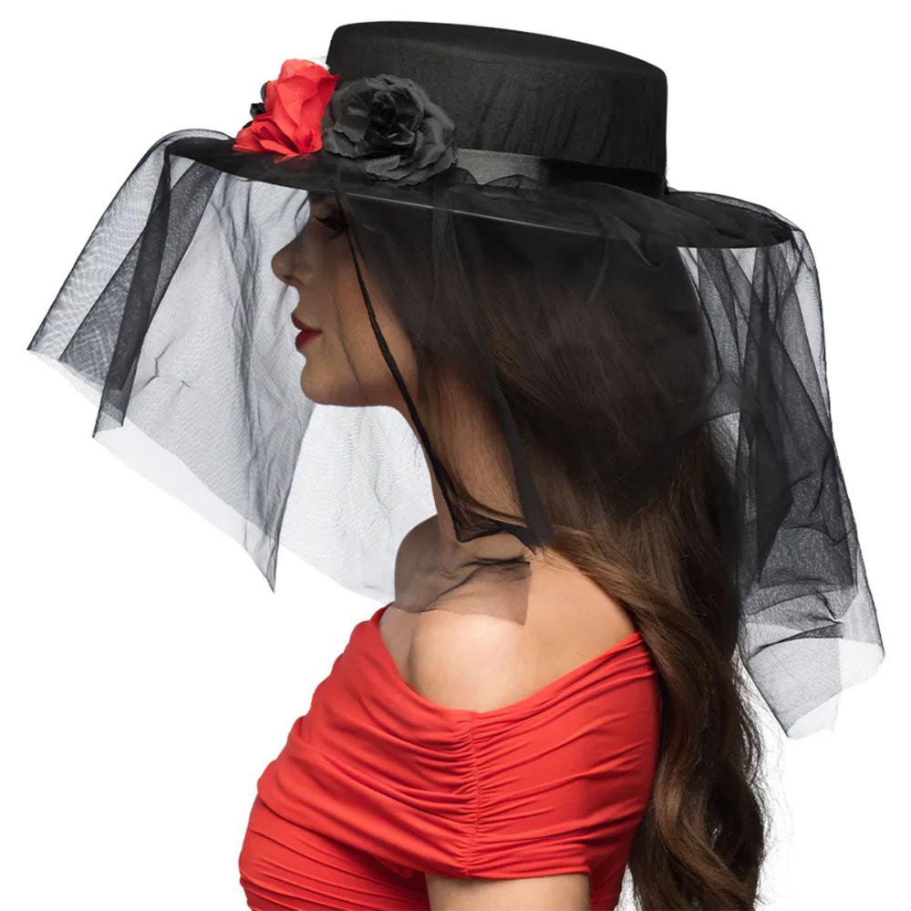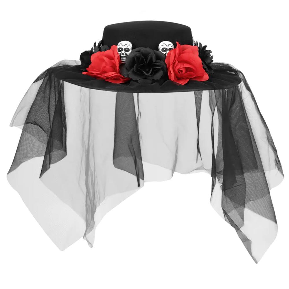 Viimeistele naamiaisasusi mustalla korkealla hatulla, jota koristavat kukat, pääkallot ja huntu. Täydellinen naamiaishattu Day of the Deadin tai Halloweenin juhliin sinulle, joka haluat erottua tyylillä.