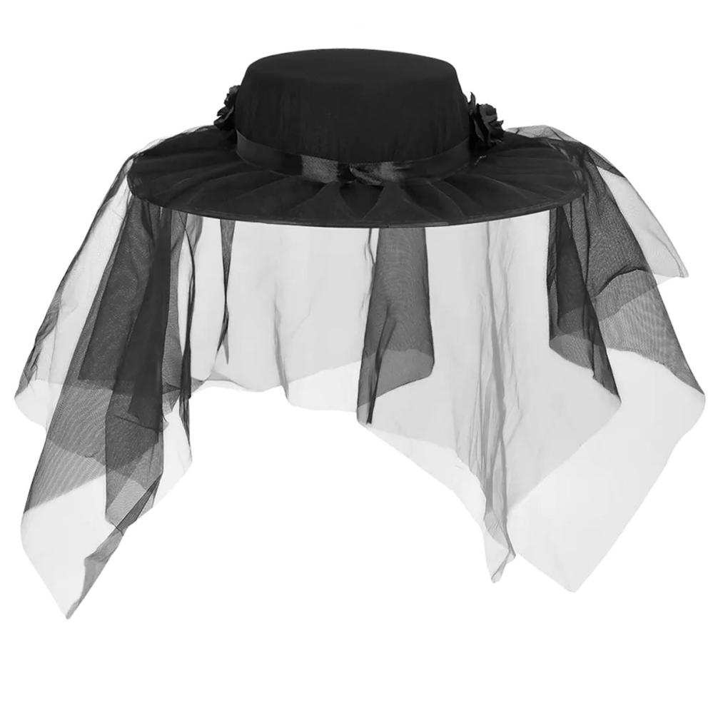 Musta Hattu Pääkalloilla, Kukilla ja Hunnulla sisältää mustan hatun, jossa on litteä kupu ja leveä lieri, jota koristavat kolme mustaa kukkaa, kaksi punaista kukkaa, kaksi valkoista pääkalloa sekä koko hatun ympäri kulkeva verkkokankainen huntu.