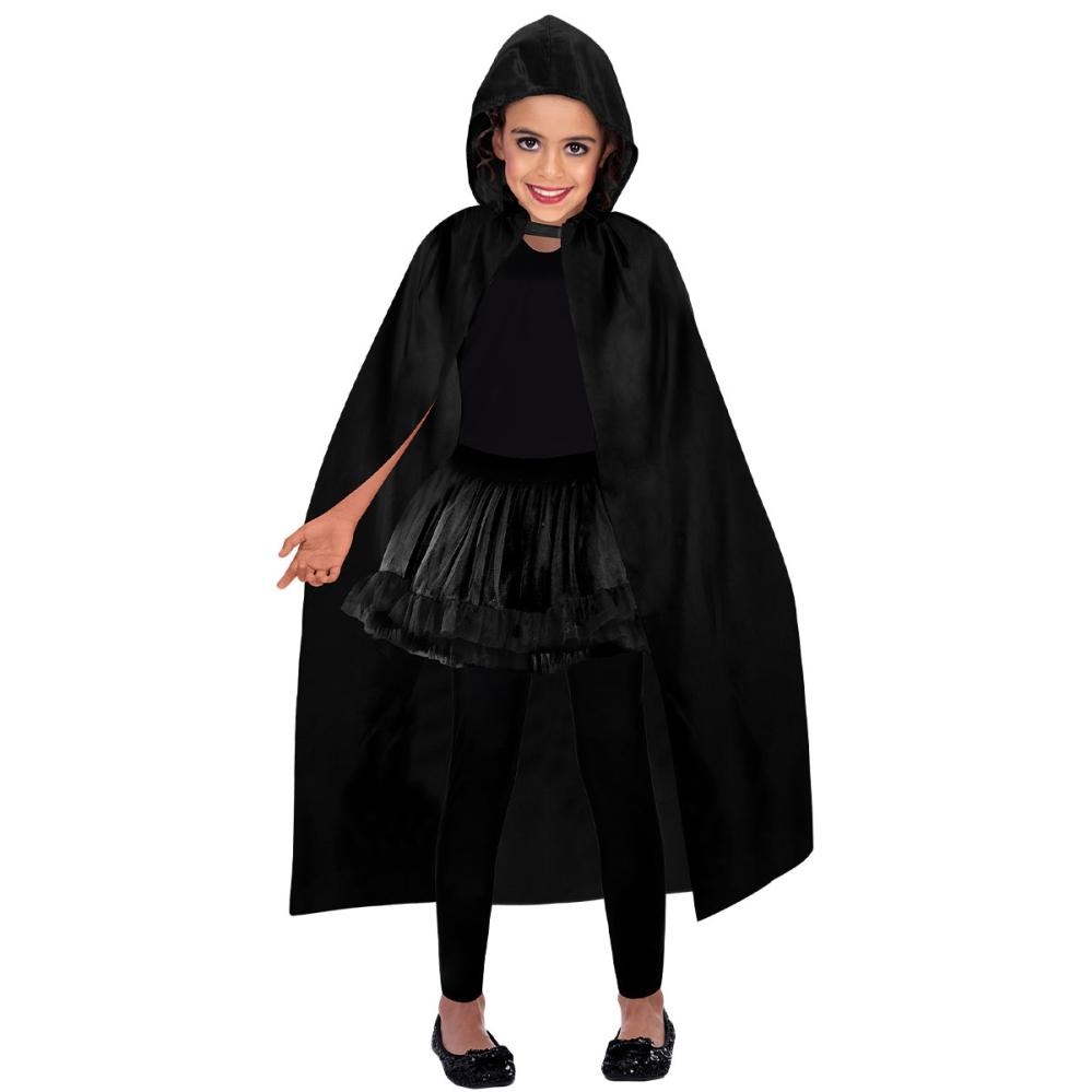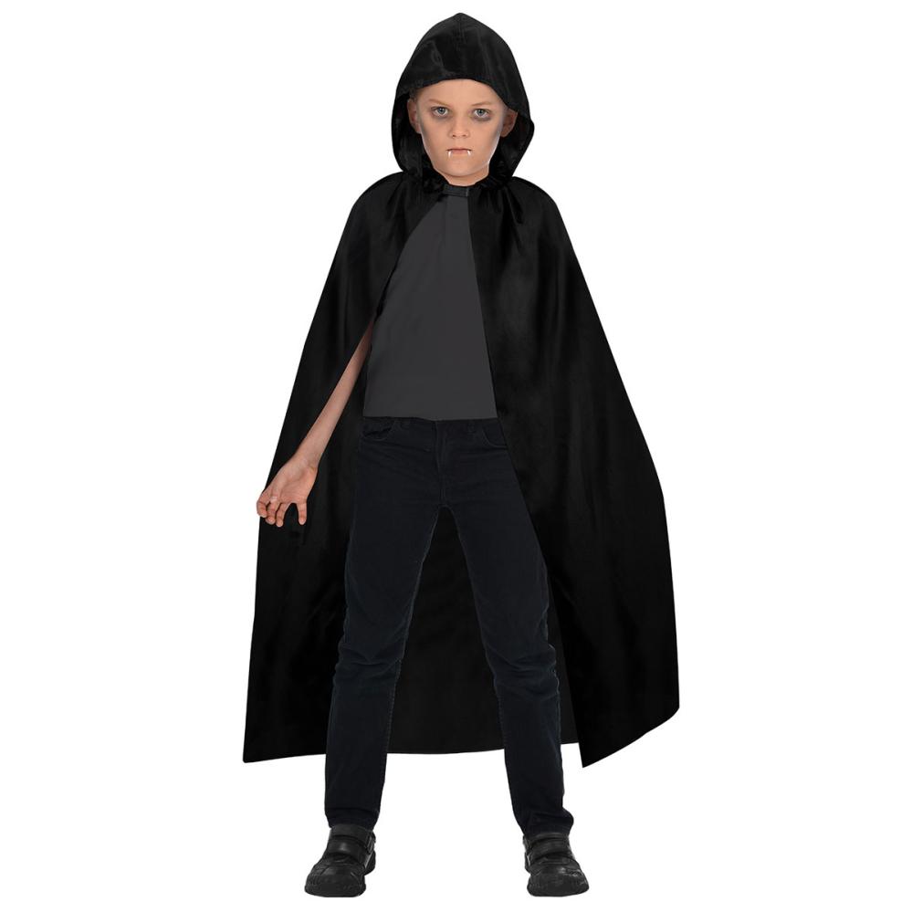 Muuta lapsen tyyliä mustalla hupullisella Halloweenviitalla, joka kiinnittyy helposti tarranauhalla. Musta lasten viitta on täydellinen vampyyriviitaksi tai naamiaisviitaksi Halloweeniin, sekä leikkiin että juhlaan.