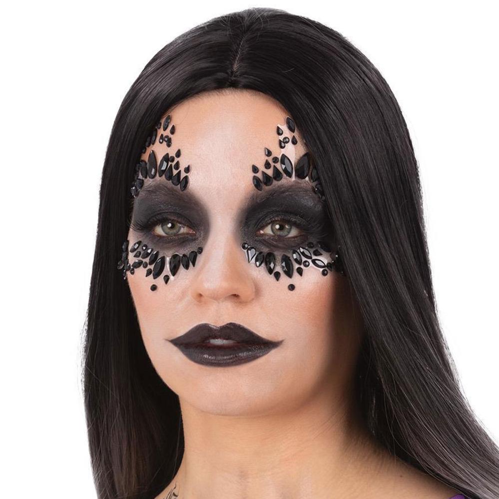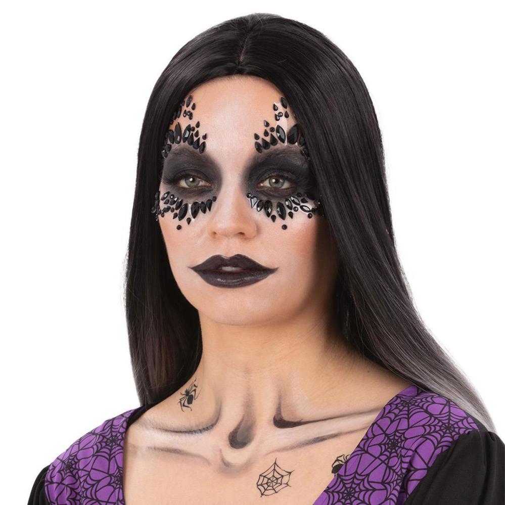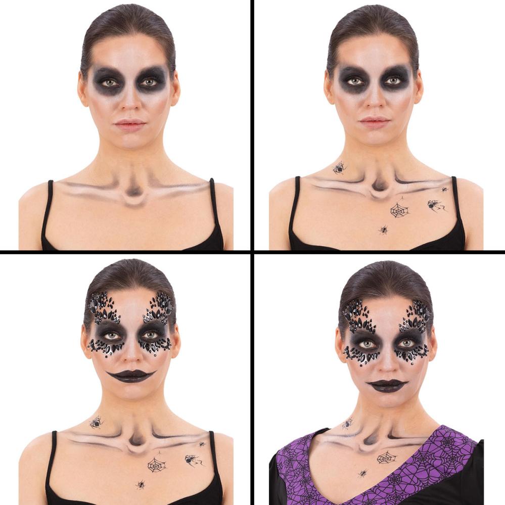 Muuta itsesi yön kuningattareksi tällä Halloween-meikkisetillä musta leski -tyyliin. Tämä on täydellinen meikkisetti, jossa on kasvomaaleja, koruja ja tatuointeja, jotka tekevät naamiaismeikistä sekä helppoa että näyttävää Halloweeniin tai juhliin.
