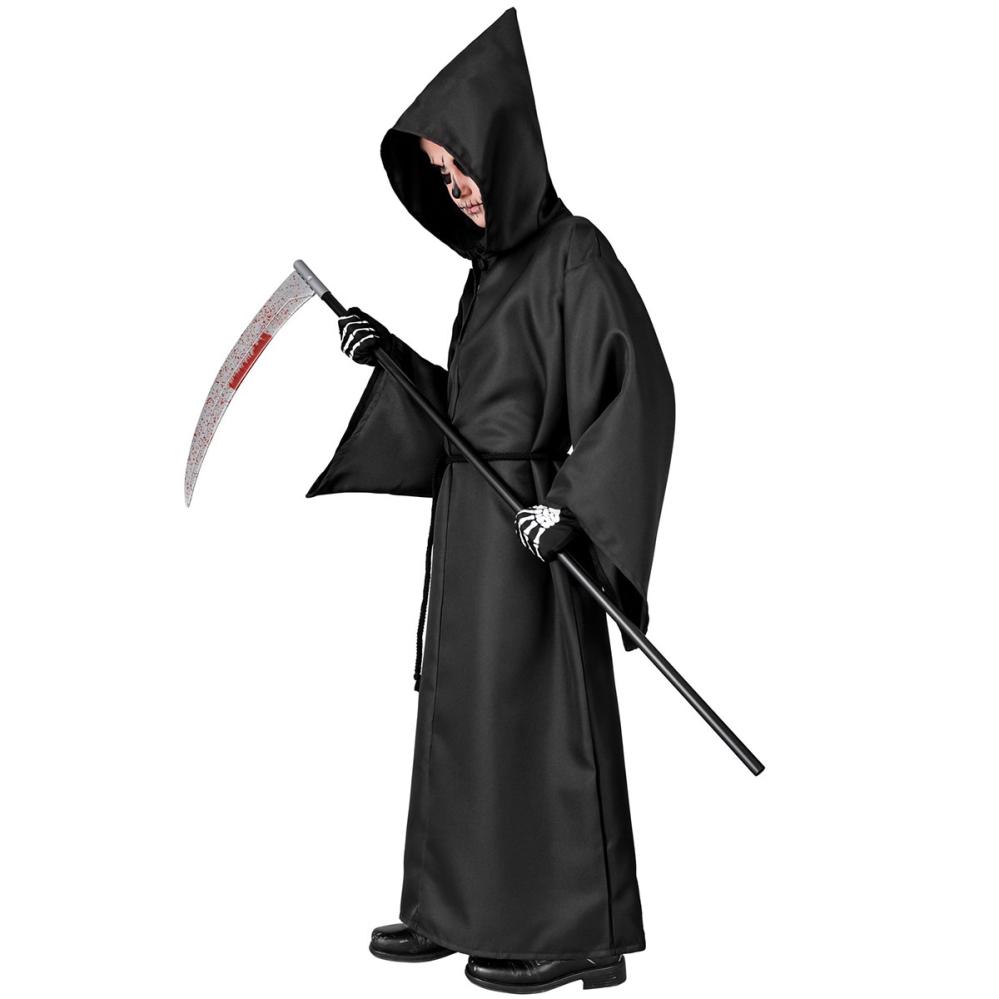 Naamiaisasu Viikatemies Lapsille sisältää mustan naamiaisasun, jossa on viikatemies-aihe. Asuun kuuluu hupputunika ja köysivyö.