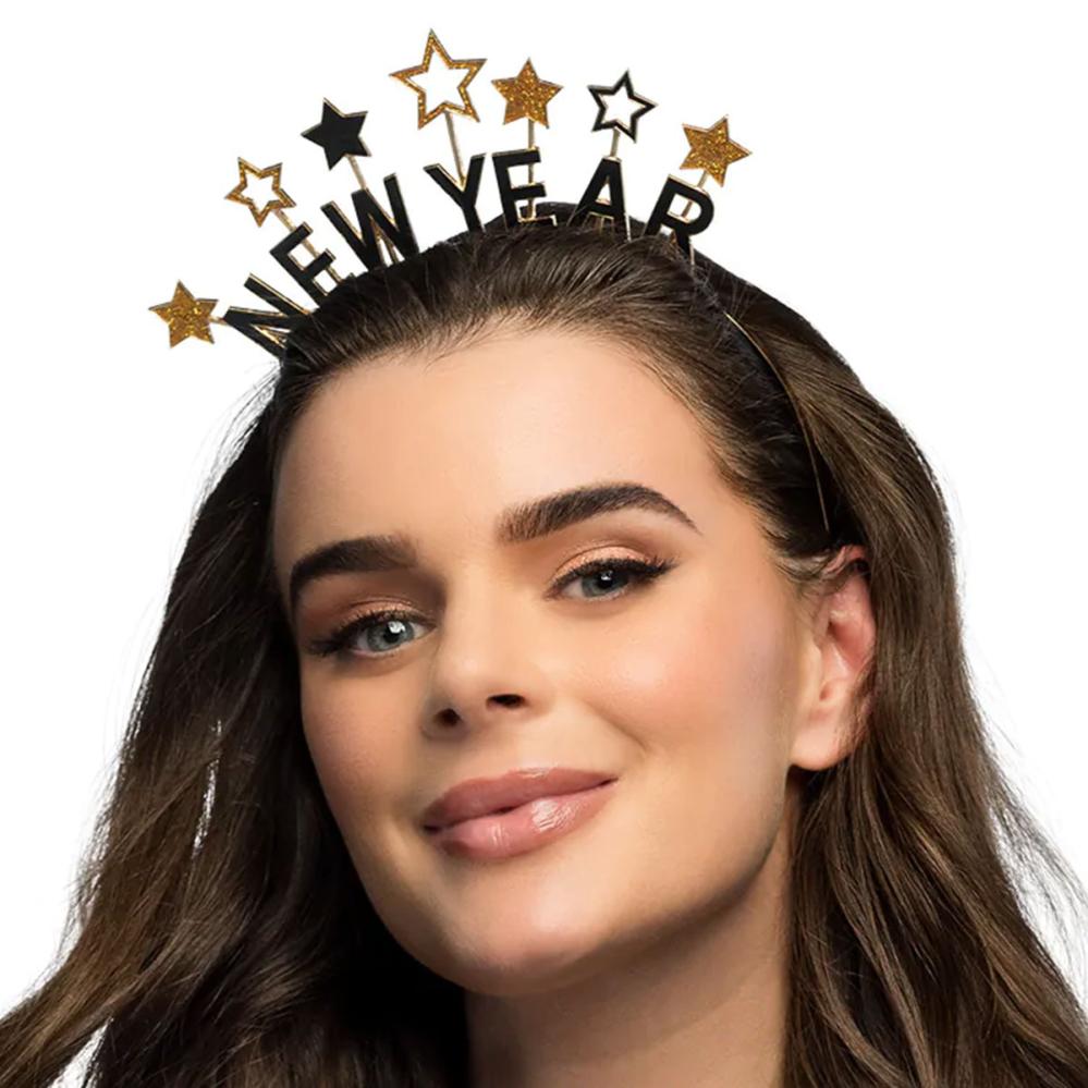 Uutena vuotena käytät metallista pantaa, jossa tähdet kimmeltävät kullassa, yksityiskohdat kohtaavat mustan ja teksti "New Year" täydentää kokonaisuuden. Uudenvuodenpanta istuu mukavasti koko illan. Metallipannassa on sileä pinta ja sitä voidaan käyttää uudelleen.