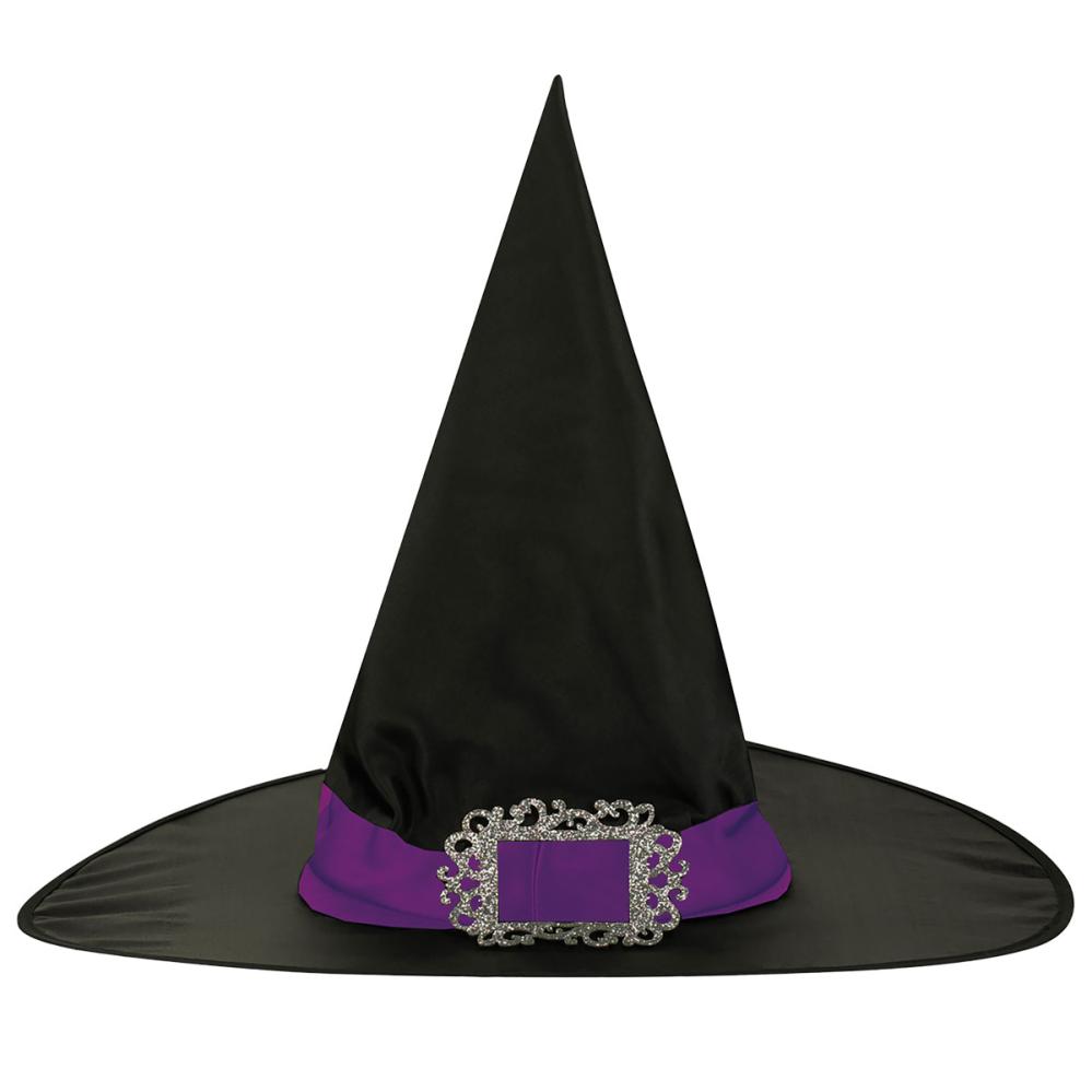 Musta noitahattu aikuiselle, jossa on tyylikäs violetti nauha ja kimalteleva hopeinen solki, tekee sinut valmiiksi Halloween-juhliin. Se on täydellinen naamiaishatuksi halloween-noidalle ja pitää tyylinsä koko yön.