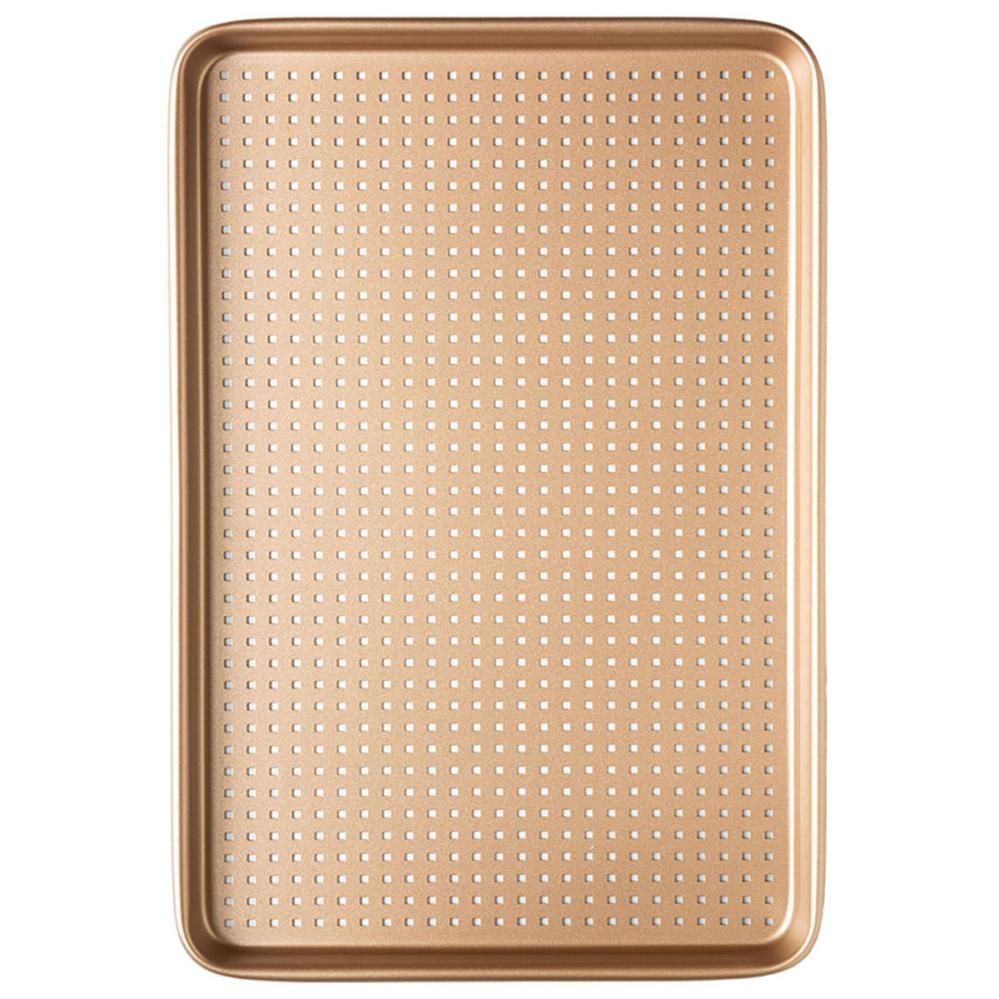 Non-Stick Suorakaiteen Muotoinen Uunivuoka Kulta sisältää suorakaiteen muotoisen, kullanvärisestä metallista valmistetun uunivuoan, jossa on non-stick-pinnoite.