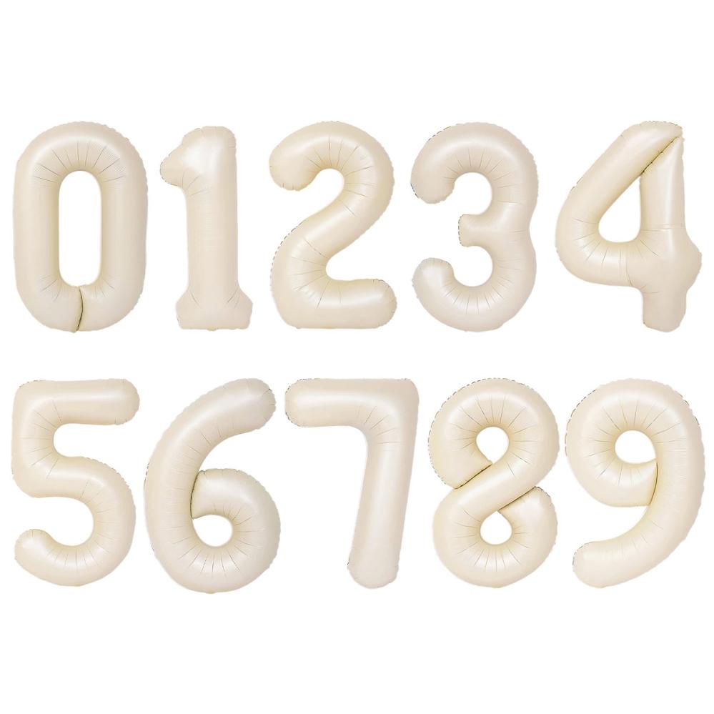 Numeroilmapallo Satiini Kerma 86 cm on numeron muotoinen foliopallo kermanvärisessä satiinisävyssä, joka täytetään ilmalla mukana tulevan puhallusputken avulla tai heliumilla.