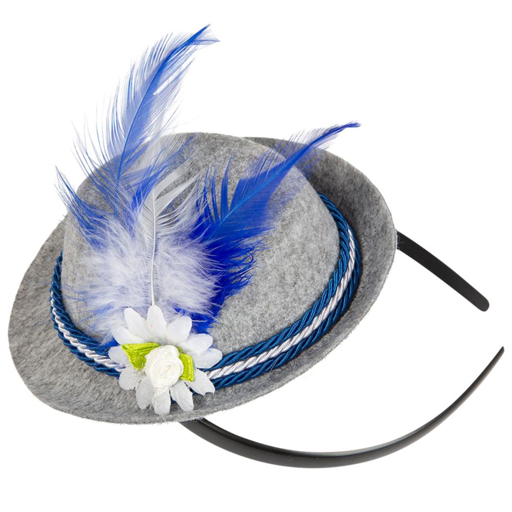 Oktoberfest Panta Tirolilaisella Hatulla Harmaa sisältää mustan pannan, jossa on erottuva harmaa tirolilainen hattu, koristeltuna kolmella sinivalkoisella nauhalla, yhteensopivan värisillä sulilla sekä valkoisella kukalla.