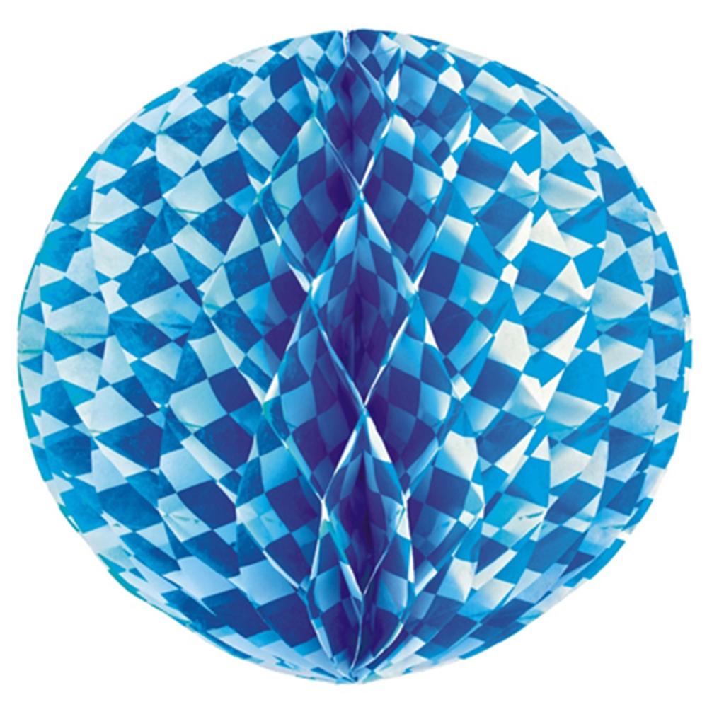 Oktoberfest Riippuva Honeycomb Baijerilainen on pallonmuotoinen honeycomb baijerilaisella kuviolla, jossa on valkoisia ja sinisiä vinoneliöitä. Helppoon kokoamiseen tarkoitetut hopeanväriset klipsit ja ripustamiseen tarkoitettu kullanvärinen naru sisältyvät.