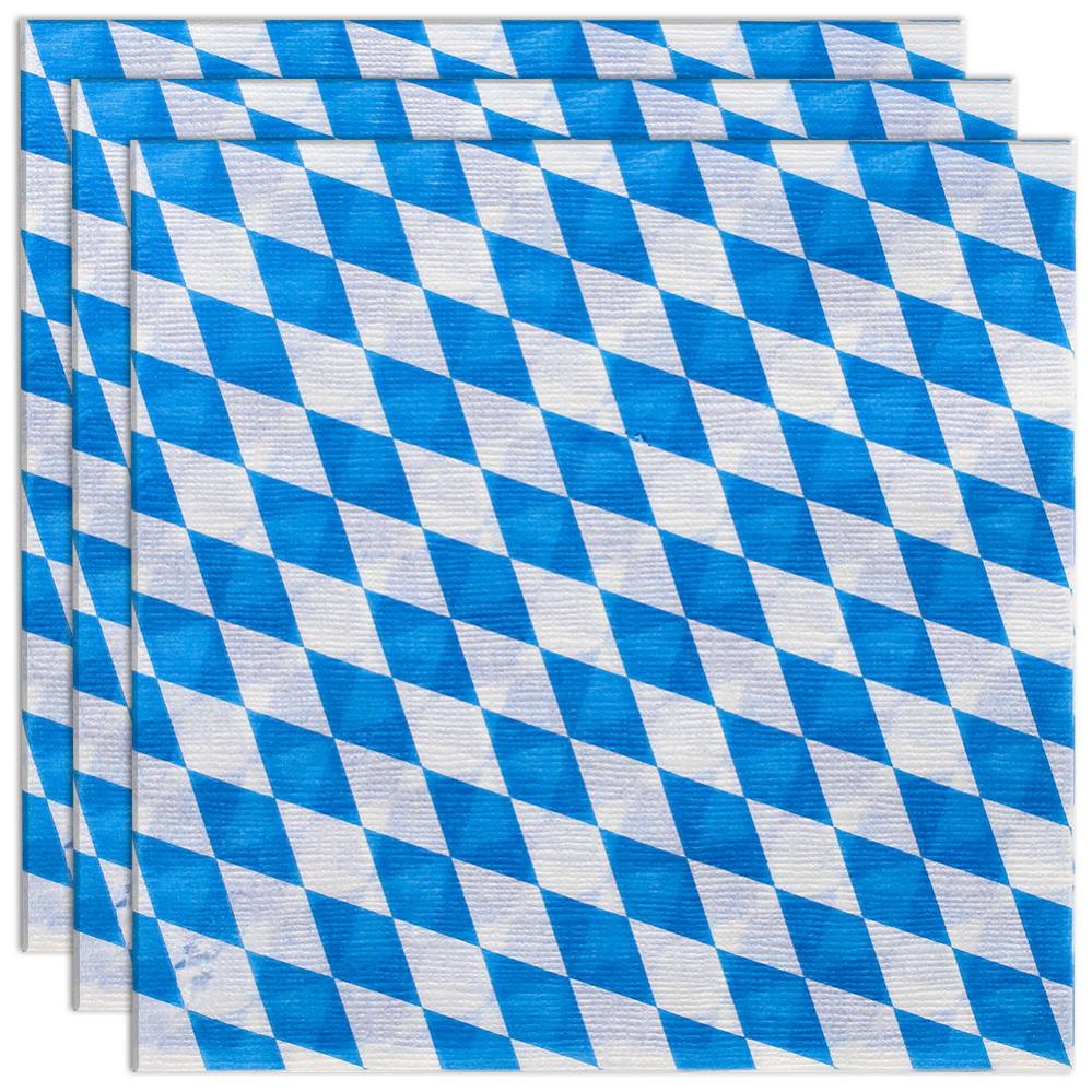 Oktoberfest Servetit Baijerilainen 100-kpl sisältää sata paperiservettiä baijerilaisella kuviolla, jossa on valkoisia ja sinisiä vinoneliöitä.