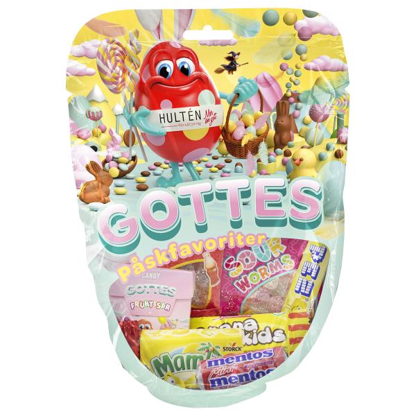 Pääsiäiskarkkivalikoima 140 g on pääsiäisaiheinen pussi, joka sisältää tikkarin, colakarkkia, happamia matoja, pastilleja, KitKat Mini suklaata, yhden Frisia vaahtokarkin, Mentos makeisia, Mamba makeisia, PEZ makeisia ja Banana Skids makeisia.