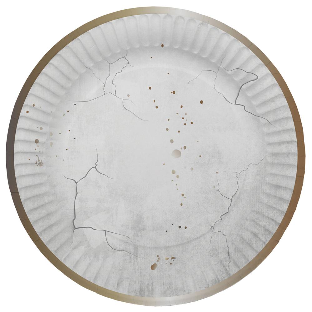 Pahvilautaset Creepy Cracks 8-kpl sisältää 8 pahvilautasta, joissa on halkeillut, harmaa kivikuosi sekä kiiltävä kultareunus ja kultayksityiskohdat.
