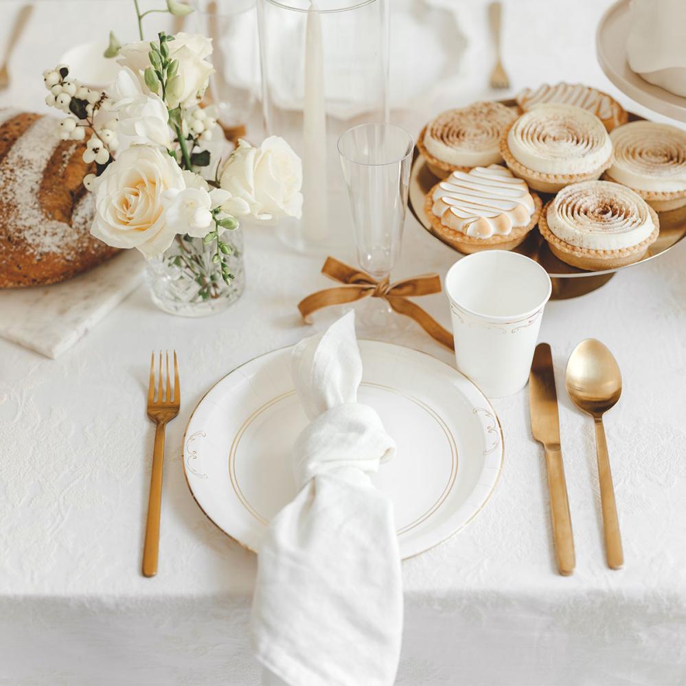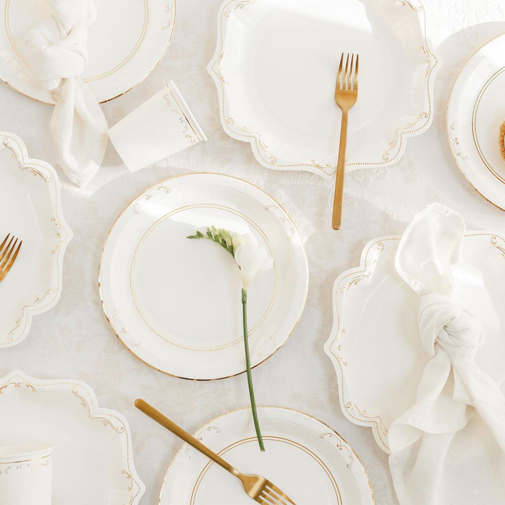 Kultaisten yksityiskohtien ansiosta nämä valkoiset kertakäyttölautaset ovat pieni juhla jo itsessään, aivan kuin pöytä olisi juuri harjoitellut näyttävää sisääntuloa. Nämä lautaset sopivat häihin, vuosijuhliin, uudenvuodenjuhlaan tai Gold & Glamour teemajuhlaan ja tekevät kattauksesta hieman tavallista tyylikkäämmän.