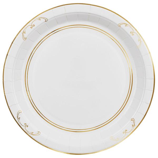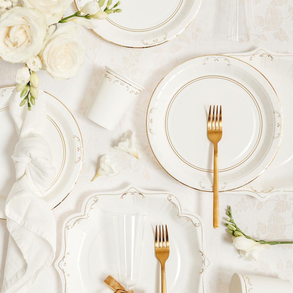 - Valkoiset kertakäyttölautaset, joissa on kultaornamentti