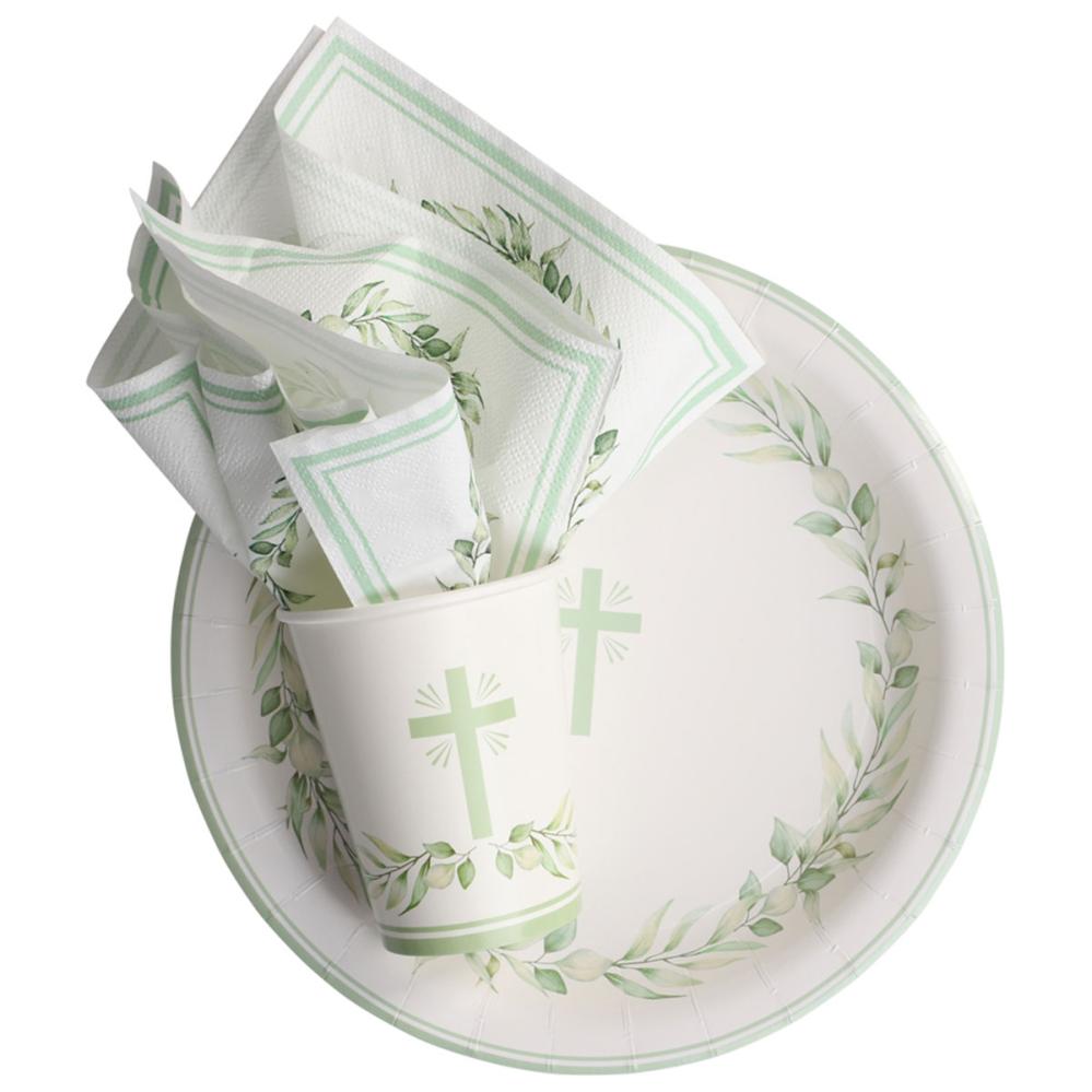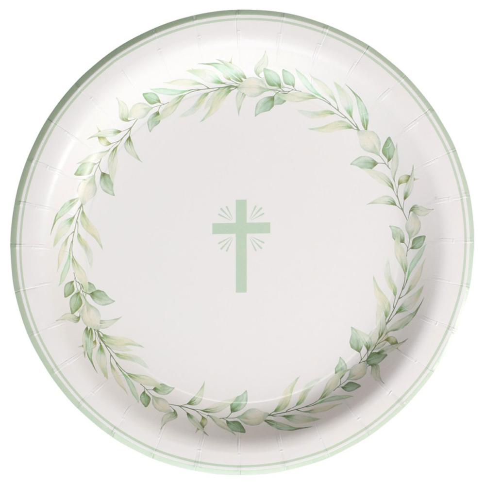 Pahvilautaset Risteillä ja Lehtiseppeleellä 8 kpl sisältää kahdeksan valkoista paperilautasta, joissa on vaaleanvihreä kuvio, keskellä risti ja reunaa kiertävä koristeellinen lehtiseppele.