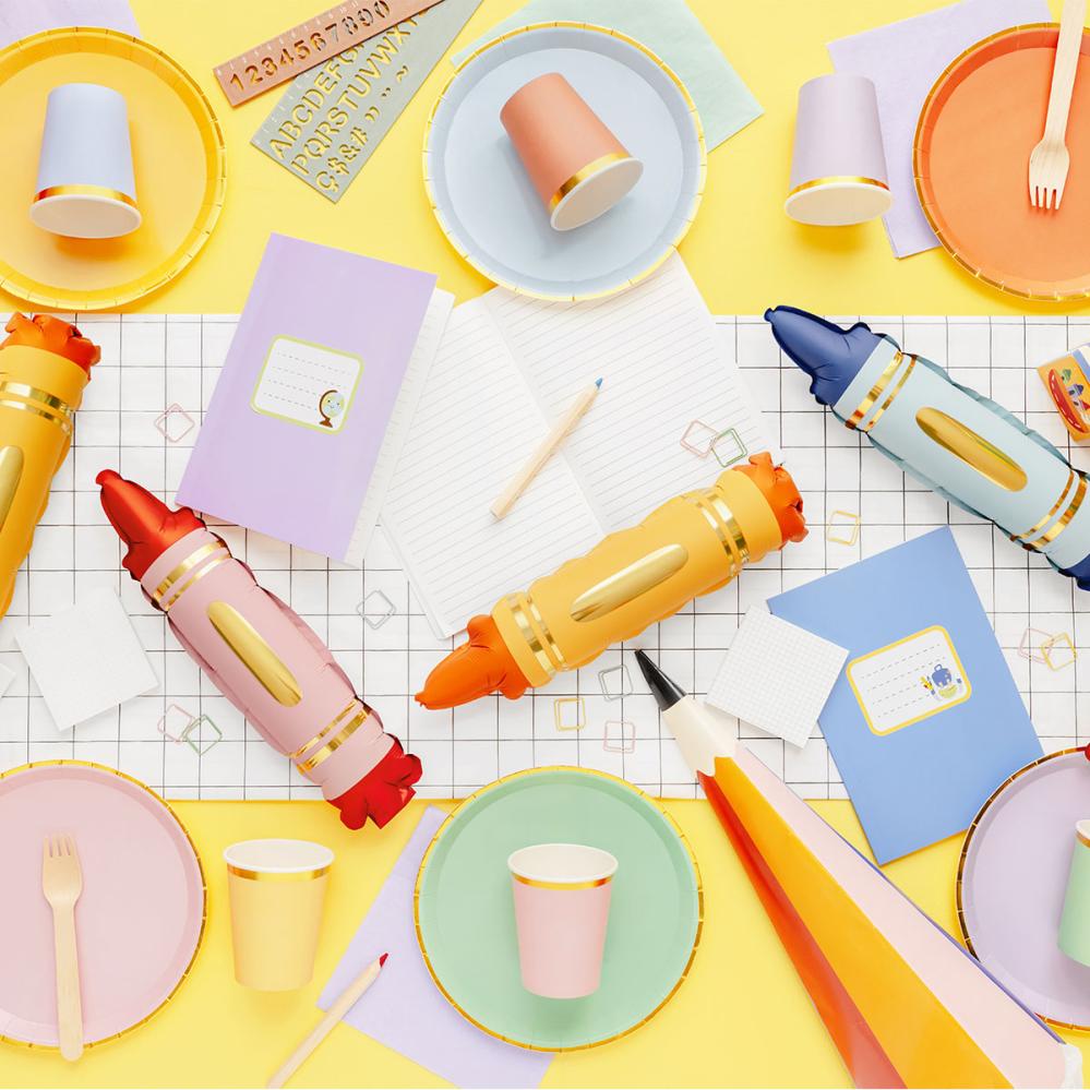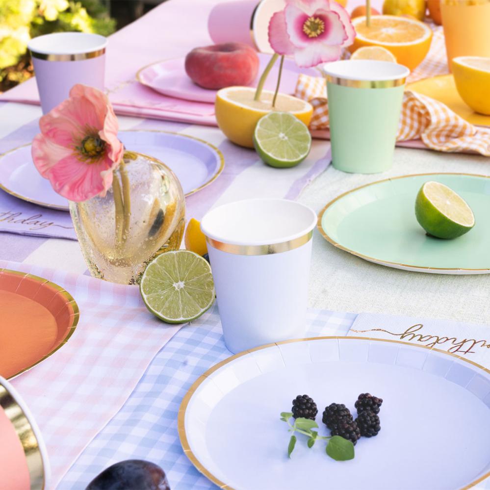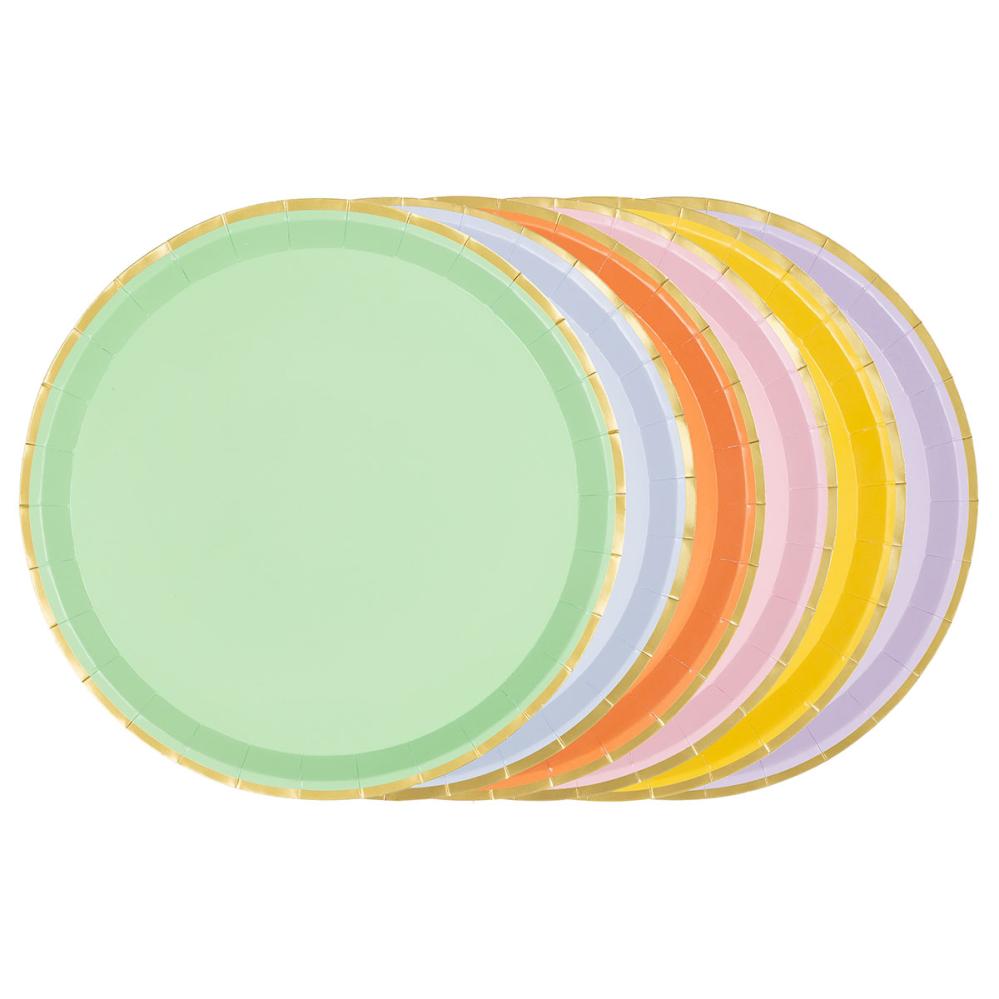 Pahvilautaset Värisekoitus Kultaisella Reunuksella 6-kpl sisältää kuusi pahvilautasta väreissä vihreä, vaaleansininen, oranssi, vaaleanpunainen, keltainen ja liila, kultavärisillä reunoilla.