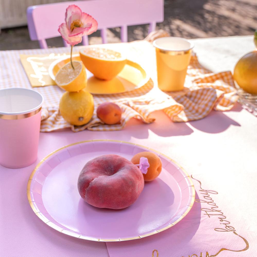 Kun keltaisen, vihreän, sinisen, vaaleanpunaisen, liilan ja oranssin väriset pahvilautaset, joissa on kultaisia yksityiskohtia, asetetaan pöytään, kattaminen on hauskempaa. Nämä kertakäyttölautaset kultaisilla yksityiskohdilla tuovat juhlavan tunnelman. Kultayksityiskohdin varustetut pahvilautaset näyttävät yhtä hyviltä kaikissa juhlissa.