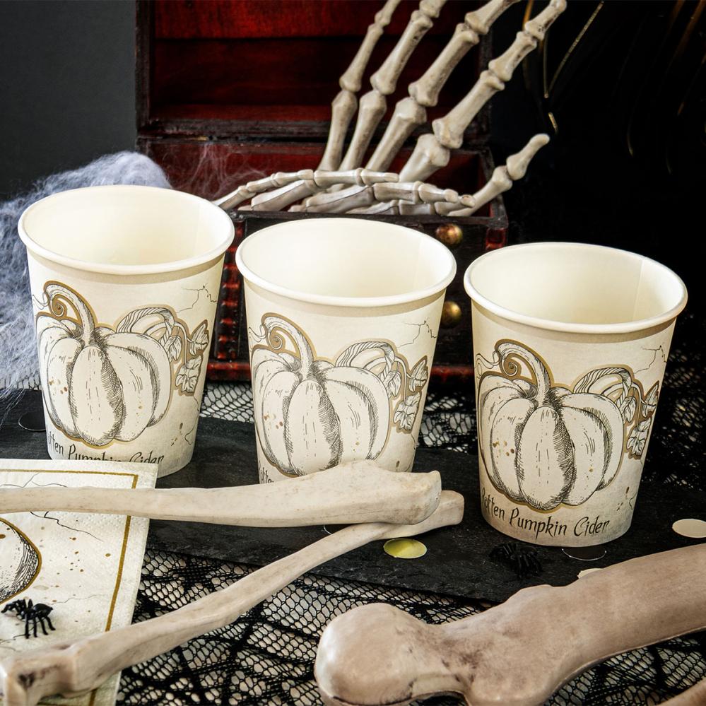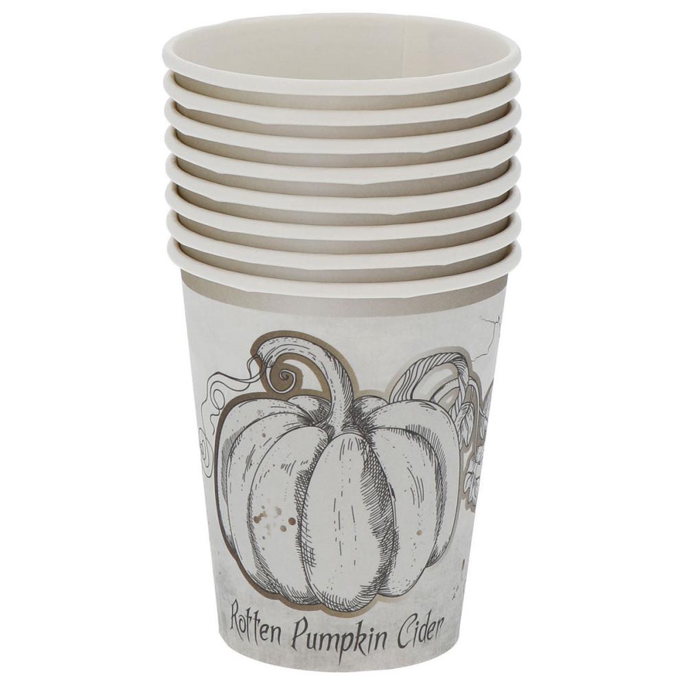 Pahvimukit Halloween Kurpitsa 6-kpl sisältää 8 valkoista pahvimukia, joissa on kauniin yksityiskohtainen piirros kurpitsasta kultayksityiskohdin. Mukin alareunassa on myös teksti "Rotten Pumpkin Cider".