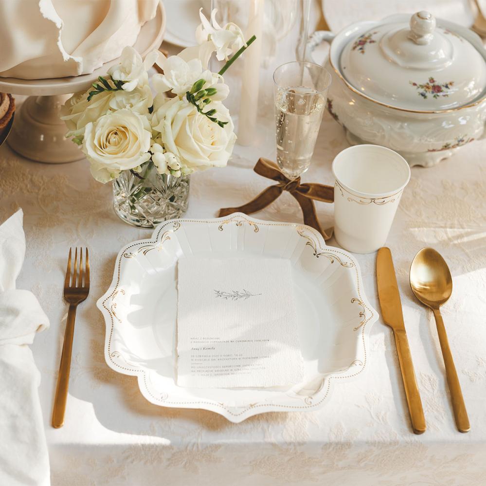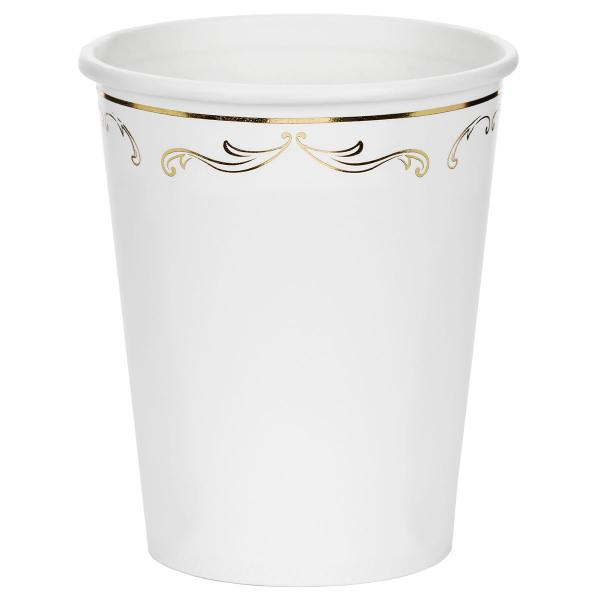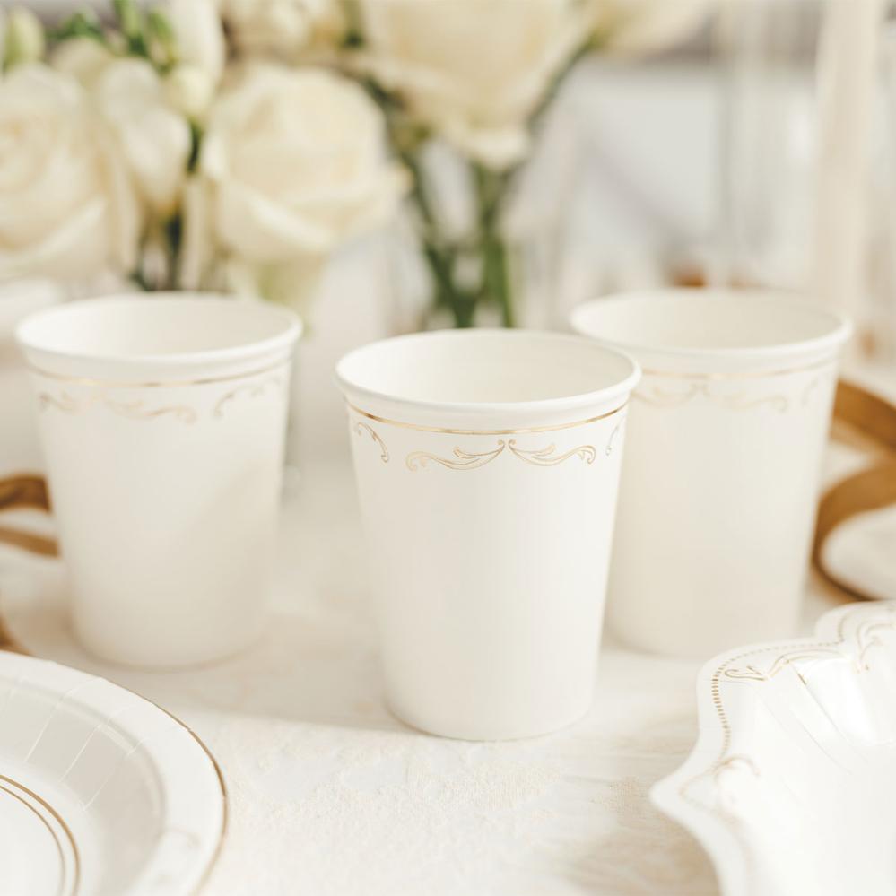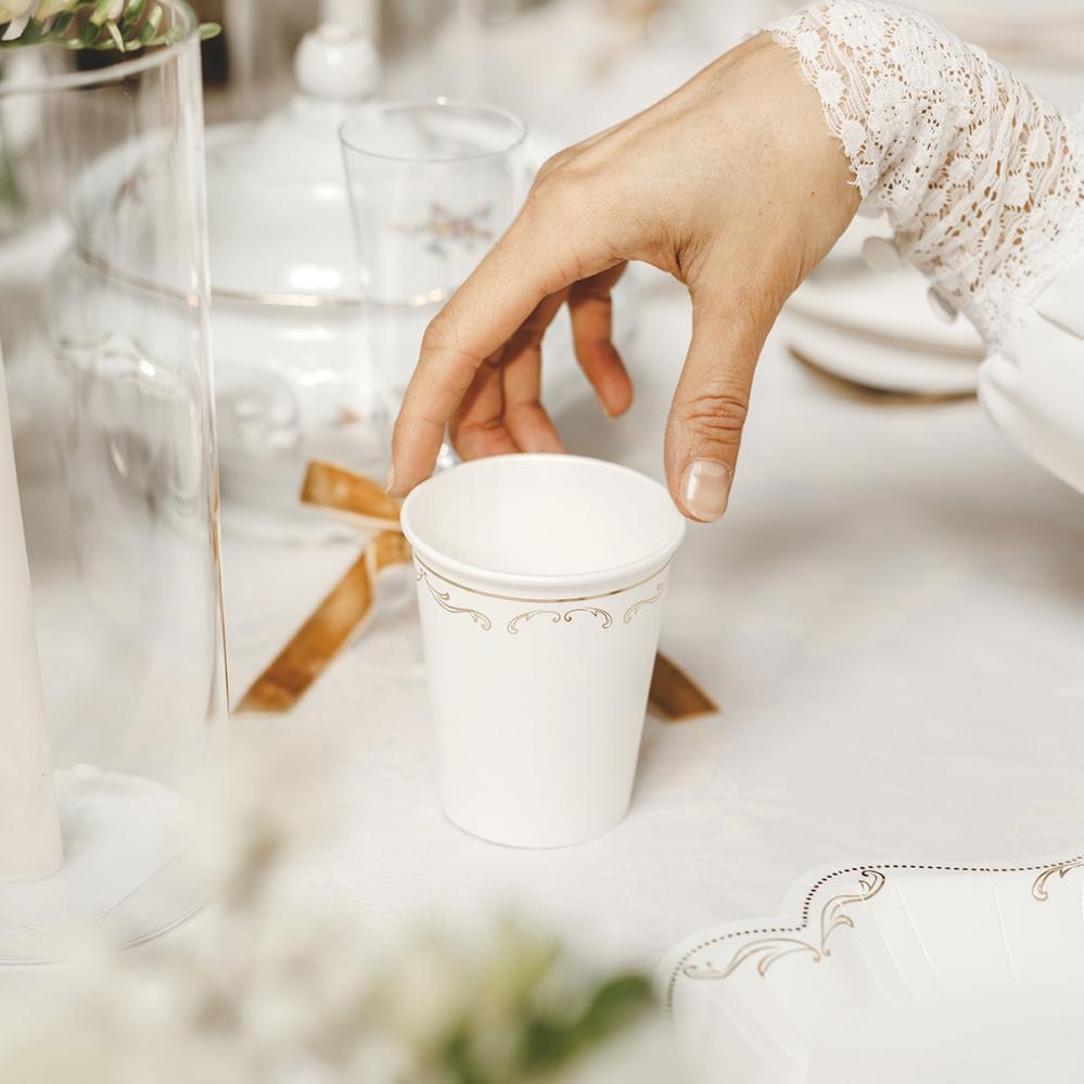 - Valkoiset kertakäyttömukit kultaisella ornamenttikuviolla