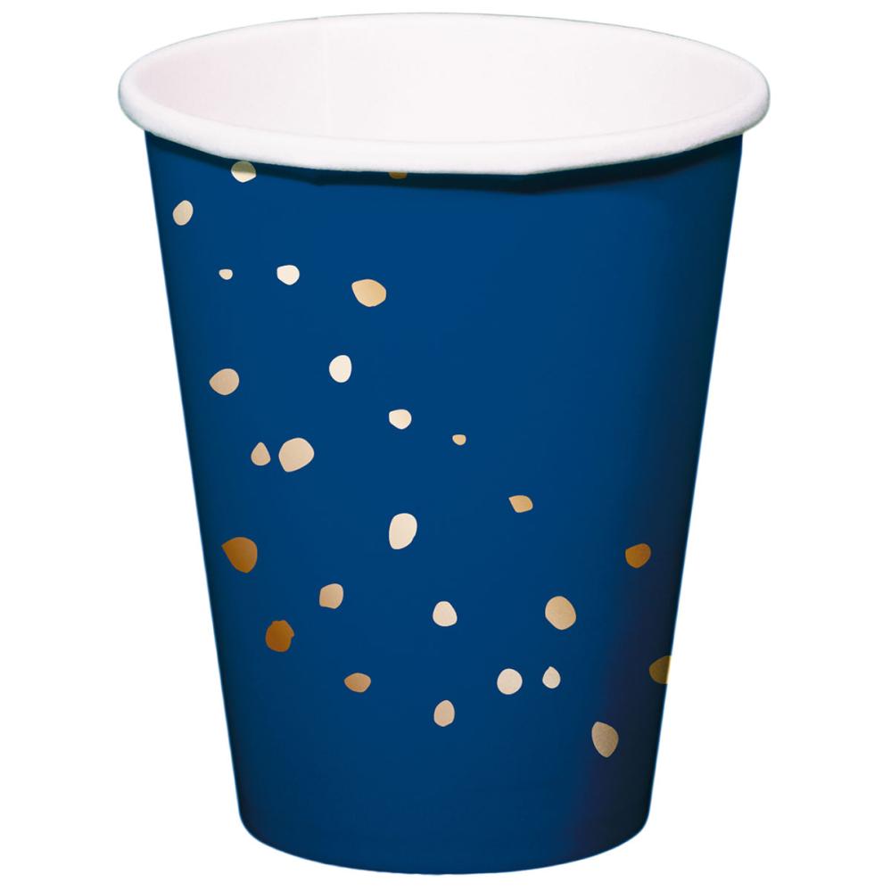 Pahvimukit Pilkuilla Sininen 8 kpl sisältää kahdeksan sinistä kertakäyttömukia, joissa on kullanvärisiä pilkkuja.