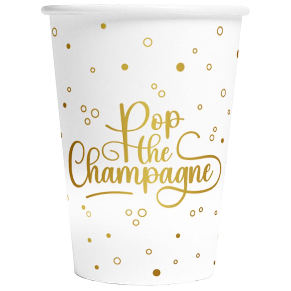 Pahvimukit Pop the Champagne 8 kpl sisältää kahdeksan valkoista pahvimukia, joissa on samppanjakuplien kuvitus ja teksti "Pop the Champagne" hillityssä kultasävyssä.