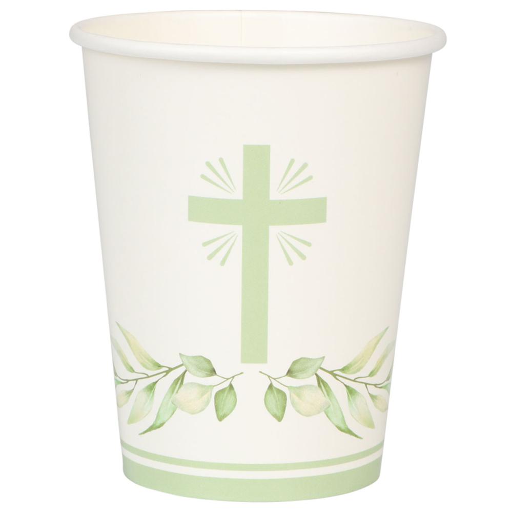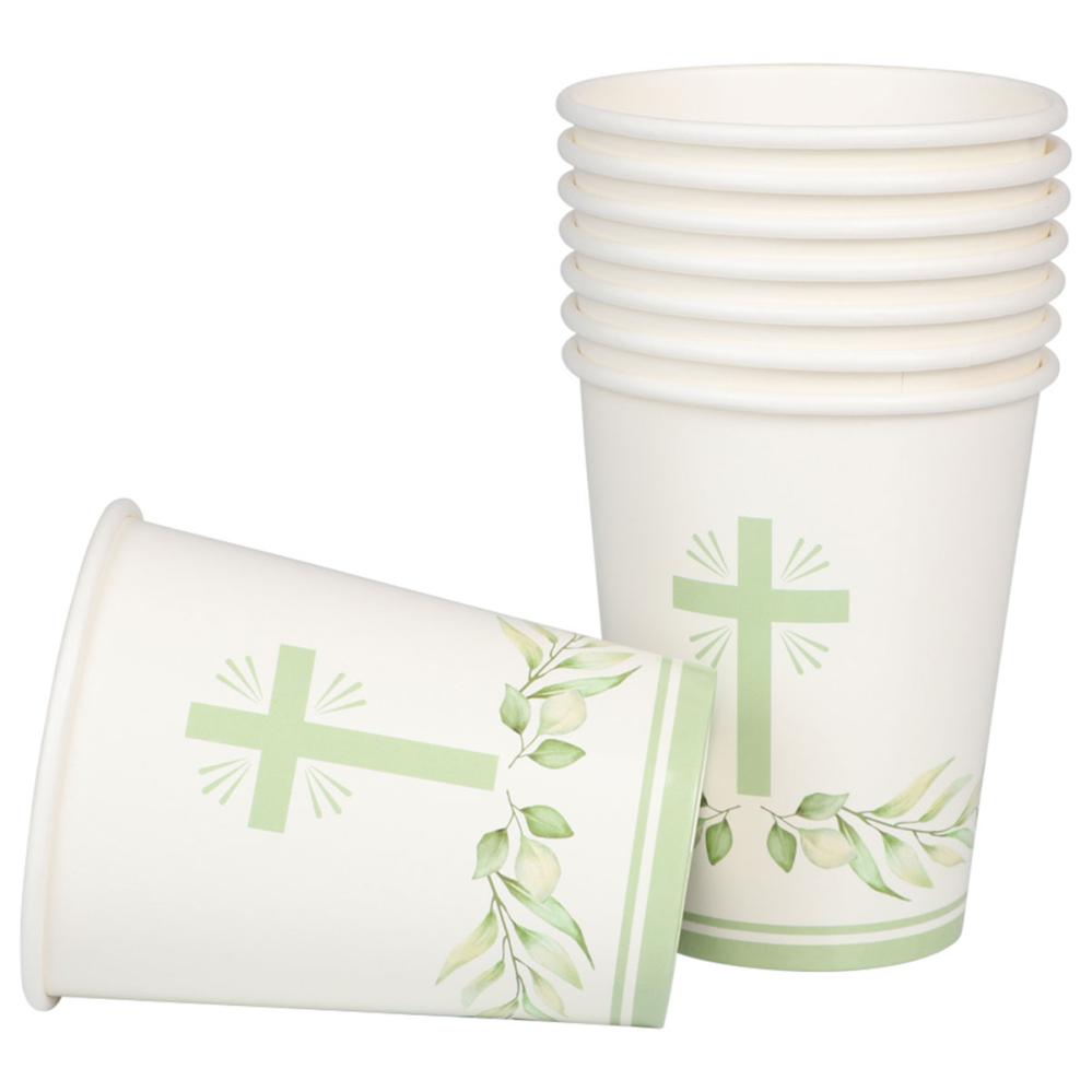 Tee kattauksesta helppo näillä kastetarvikkeilla, jotka koostuvat valkoisista pahvimukeista, joissa on vaaleanvihreä risti ja lehtiseppele. Ne sopivat täydellisesti pahvimukeiksi ristiäisiin ja sopivat myös pahvimukeiksi häihin. Ne ovat myös tyylikäs lisä konfirmaation juhlintaan.