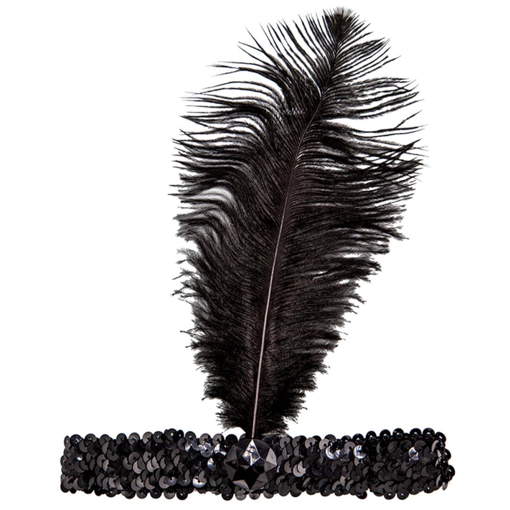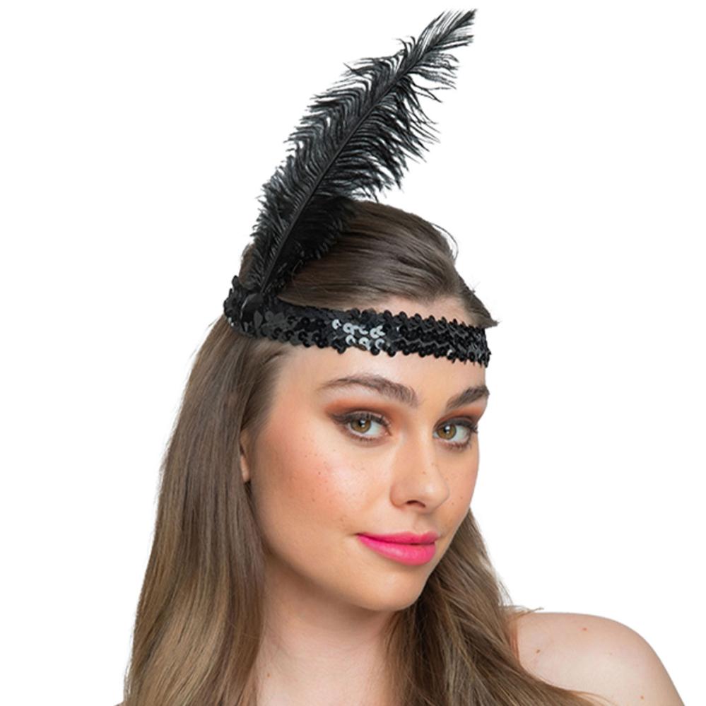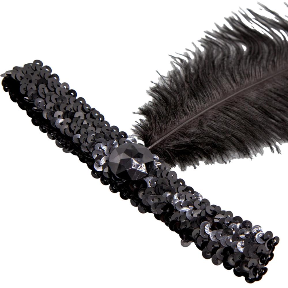 Paljetti Otsapanta Höyhenellä Musta on musta otsapanta, jossa on paljetteja ja suuri höyhen.