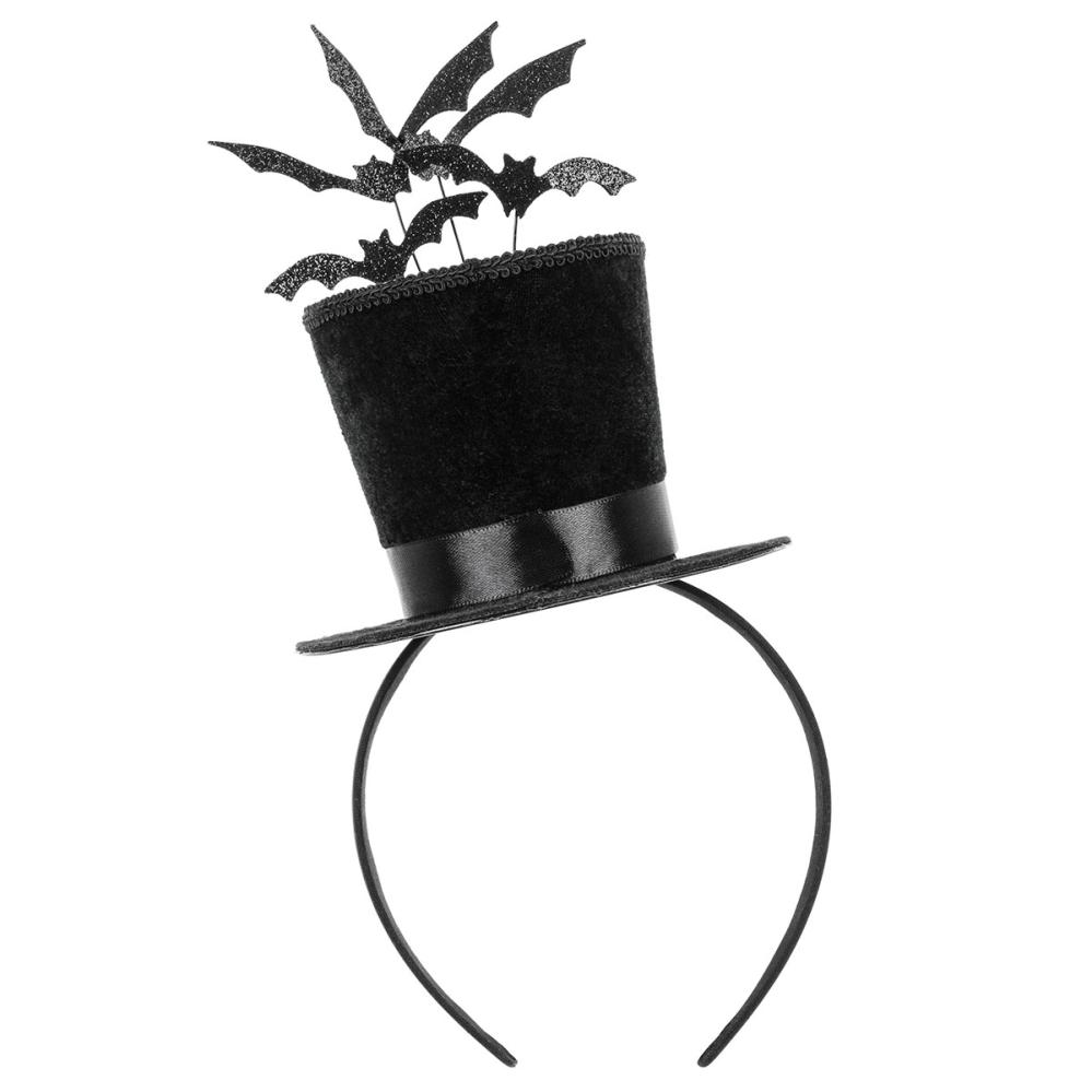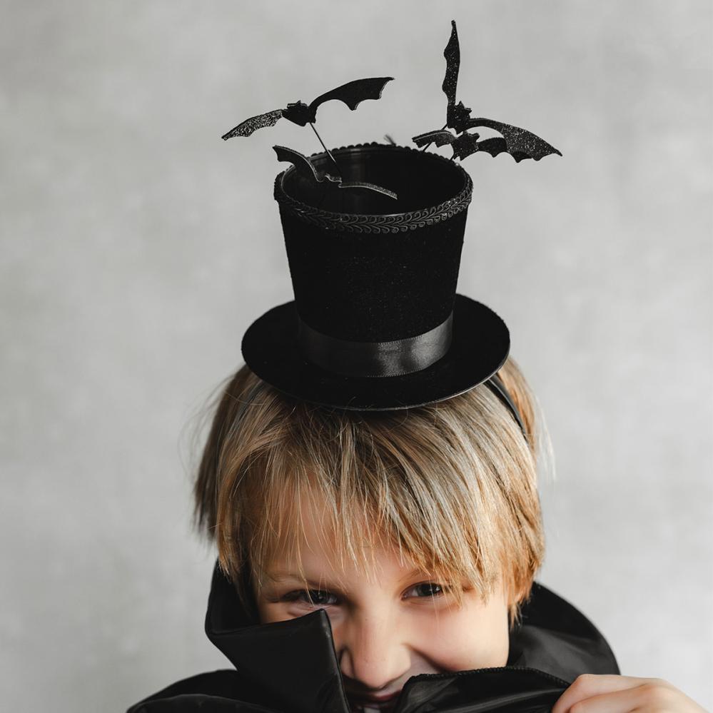 Panta Silinterihatulla ja Lepakoilla sisältää mustan pannan, jossa on ulkoneva silinterihattu, joka on koristeltu ulkonevilla lepakoilla.