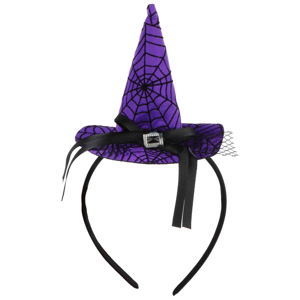 Erottaudu seuraavissa halloweennaamiaisissa pannalla, jossa on noitahattu. Tässä pannassa on violetti noitahattu, jossa on musta hämähäkinseittikuvio, ja sitä on koristeltu verkkokankaalla sekä kimaltavalla soljella lisätehosteeksi.