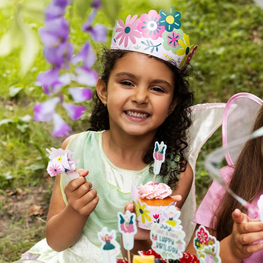 Paperikruunu Värikkäät Kukat 6 kpl sisältää kuusi vaaleanpunaista paperikruunua, joissa on värikkäiden kukkien kuvio. Kruunujen kokoa voidaan helposti säätää.