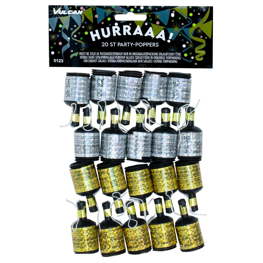 Party Poppers Kulta/Hopea 20-kpl sisältää kaksikymmentä party poppersia, joissa on kulta- ja hopeaserpentiinit, tasaisesti jakautuneina värien kesken, ja serpentiinit sinkoutuvat ulos, kun valkoista narua vedetään.