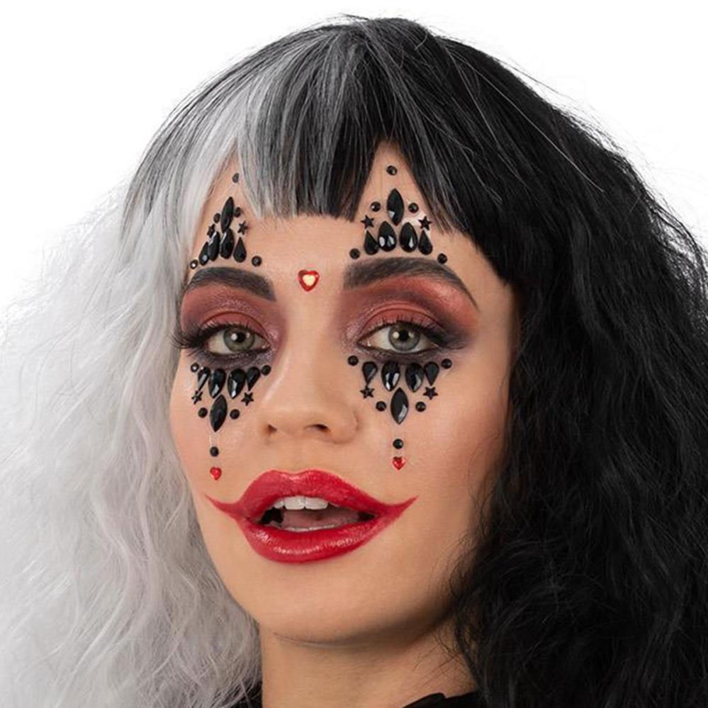 Tee naamiaisasustasi unohtumaton näillä näyttävillä kasvokoruilla. Pakkaus sisältää mustia kasvojalokiviä ja punaisia sydämiä kätevissä tarroissa, jotka kiinnittyvät helposti ihoon. Täydellinen valinta kasvojalokiviksi juhliin.