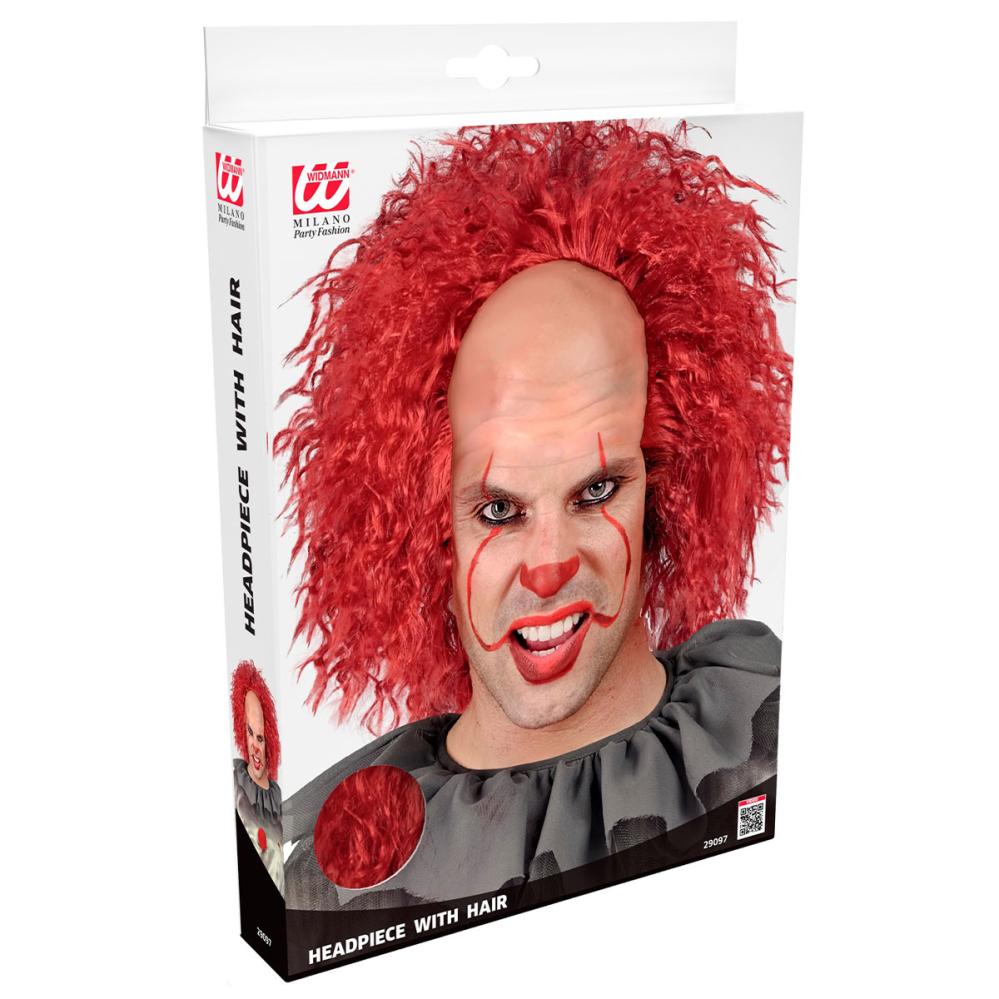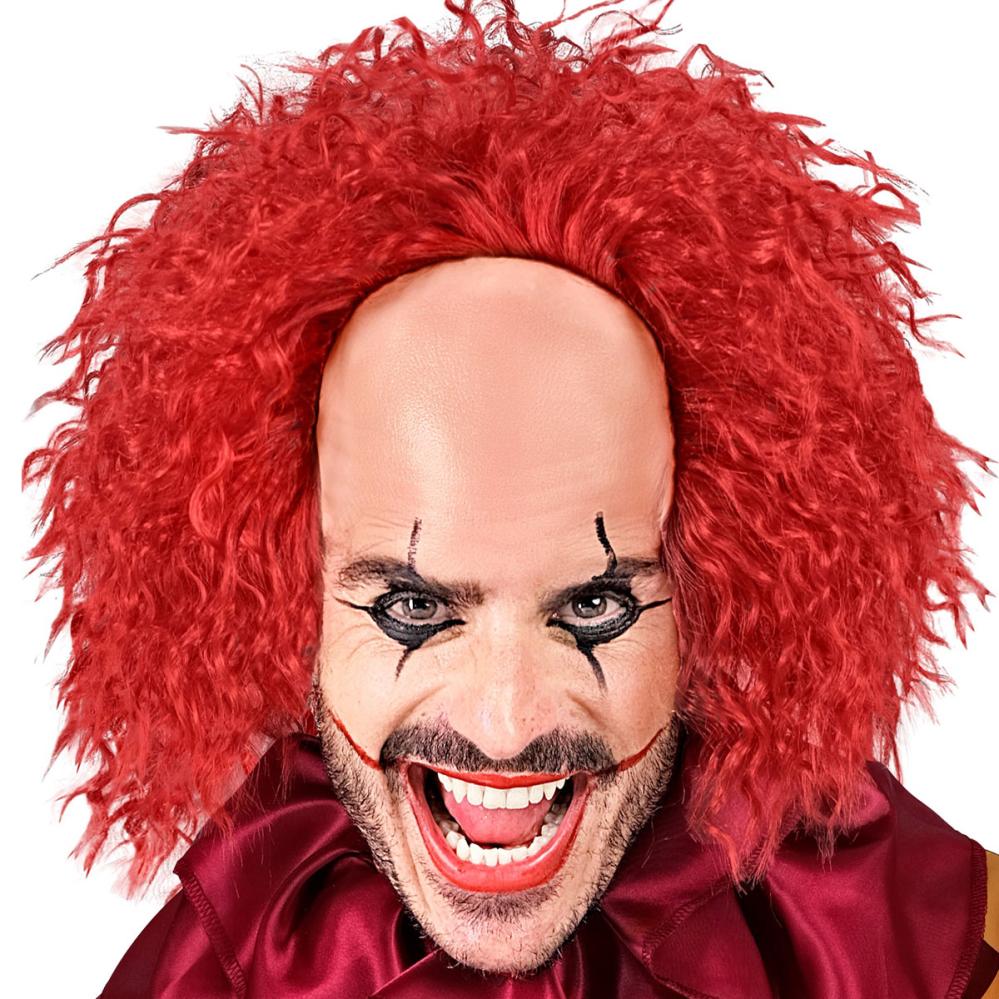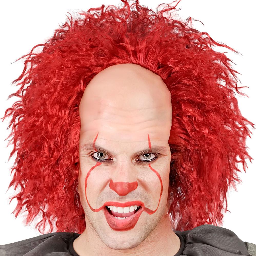 Punainen Pelleperuukki Kaljulla sisältää synteettisen peruukin, jossa on pörröiset punaiset hiukset ja kalju päälaki.