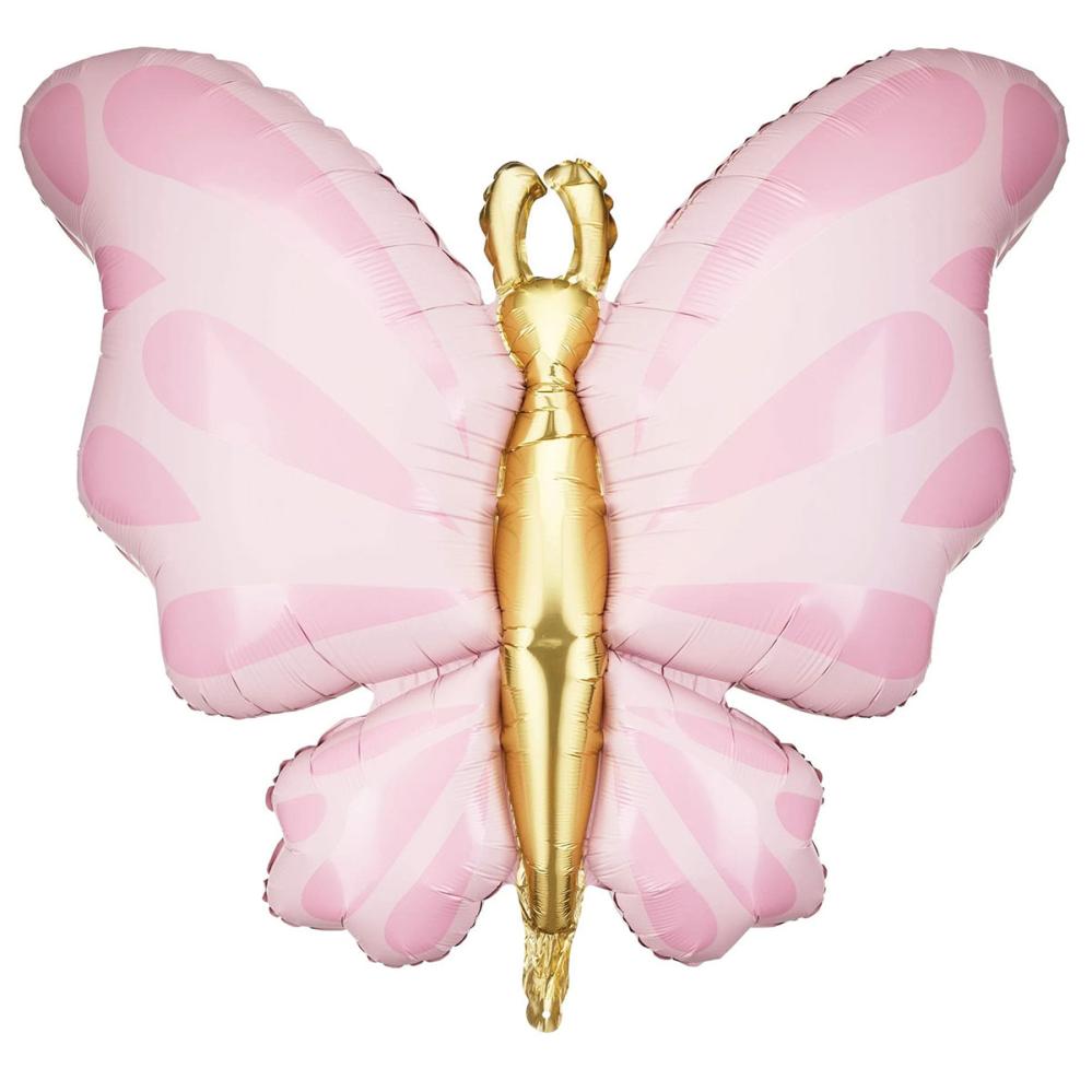 Perhonen Folioilmapallo Pinkki/Kulta sisältää foliopallon, joka on kultainen perhonen, jossa on pinkit siivet. Pallon voi täyttää ilmalla mukana tulevalla pillillä tai heliumilla.