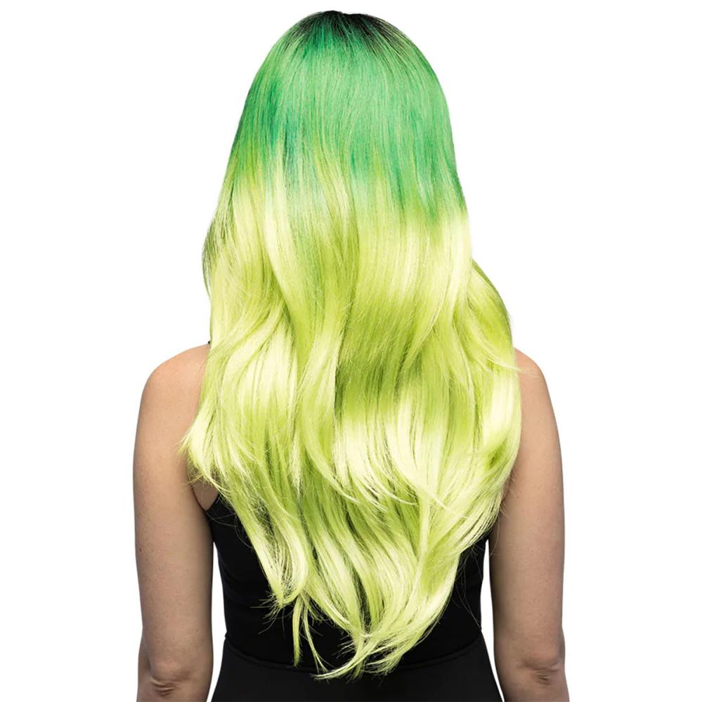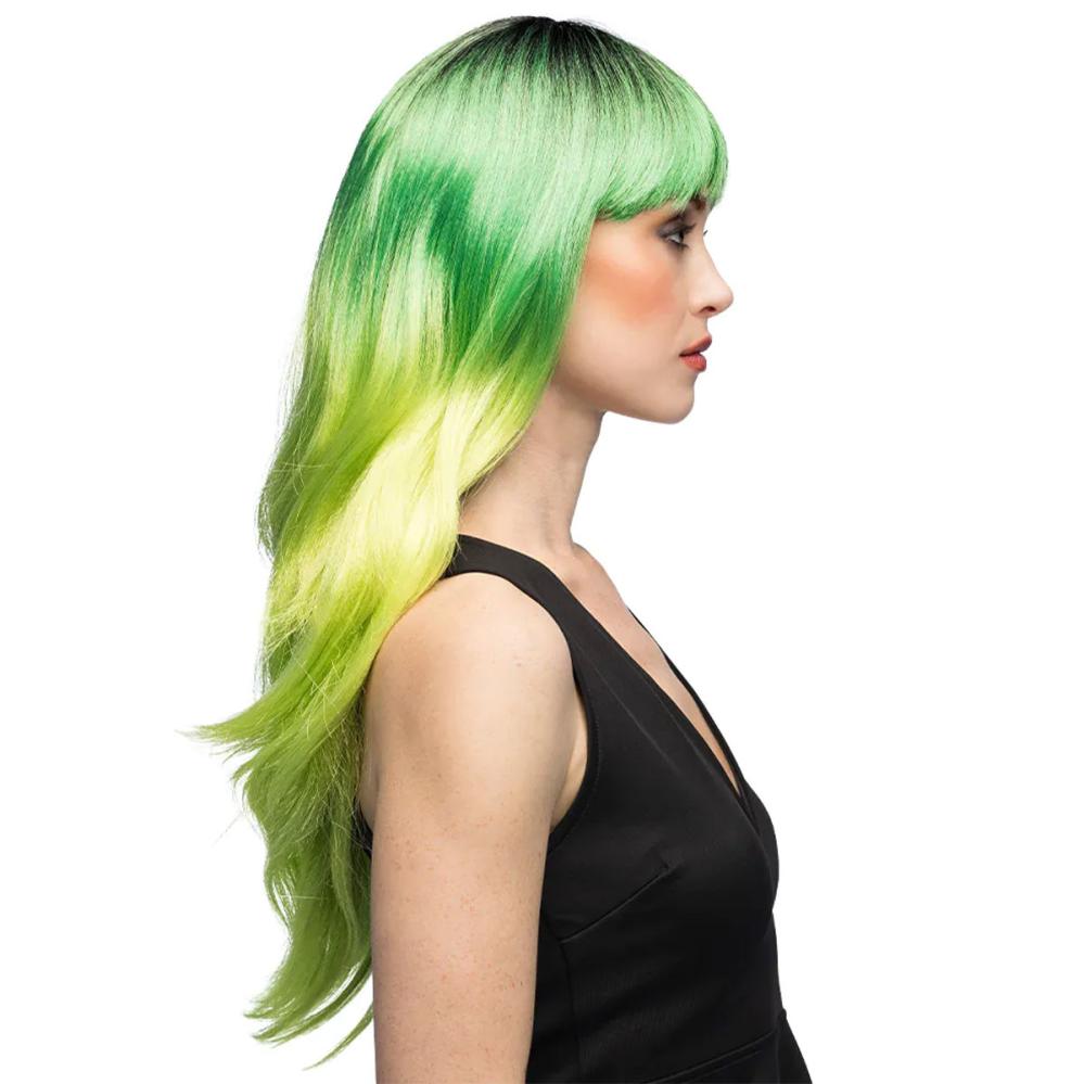 Peruukki Otsatukalla Vihreä on pitkä peruukki, jossa on otsatukka ja kevyesti laineikkaat hiukset vihreissä sävyissä.
