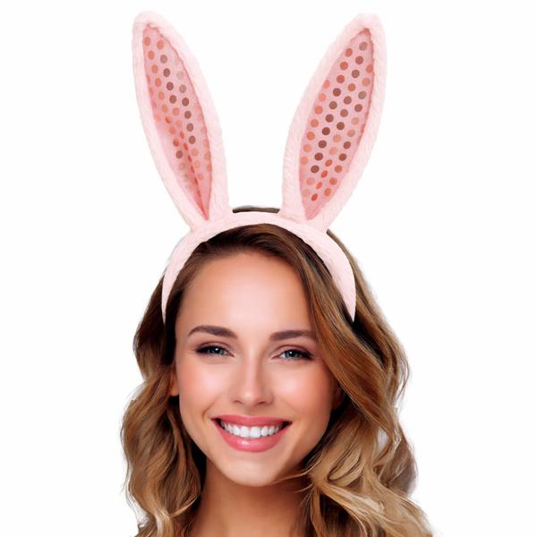 Pinkki Pupunkorvahiuspanta Paljeteilla on pörröinen pinkki hiuspanta, jossa on ylöspäin törröttävät pupunkorvat paljettikoristeilla.