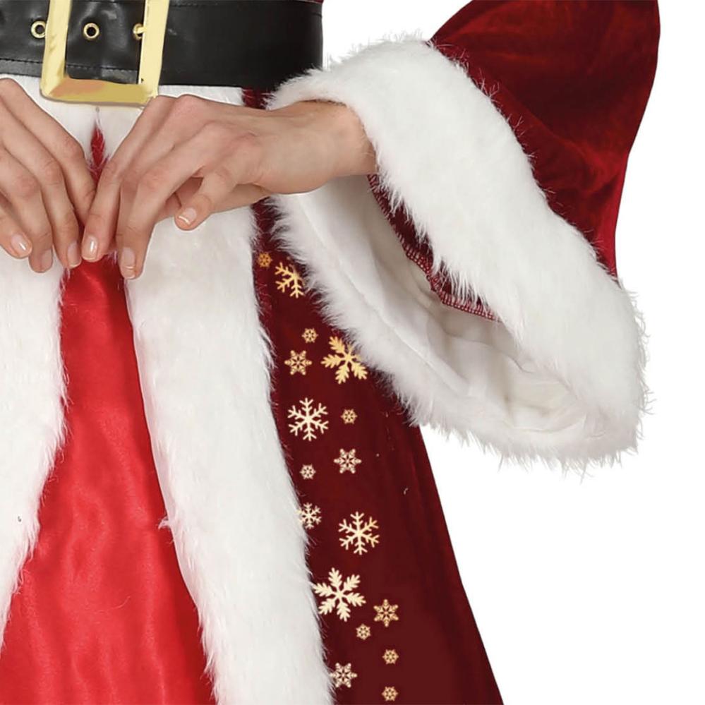 Pitkä Joulumekko Asusteineen sisältää jouluasun, johon kuuluu tonttulakki, musta vyötärövyö kultaisella soljella sekä pitkä punainen joulumekko, jossa on valkoinen tekoturkisreunus ja kullanvärisiä lumihiutaleita sivuilla.