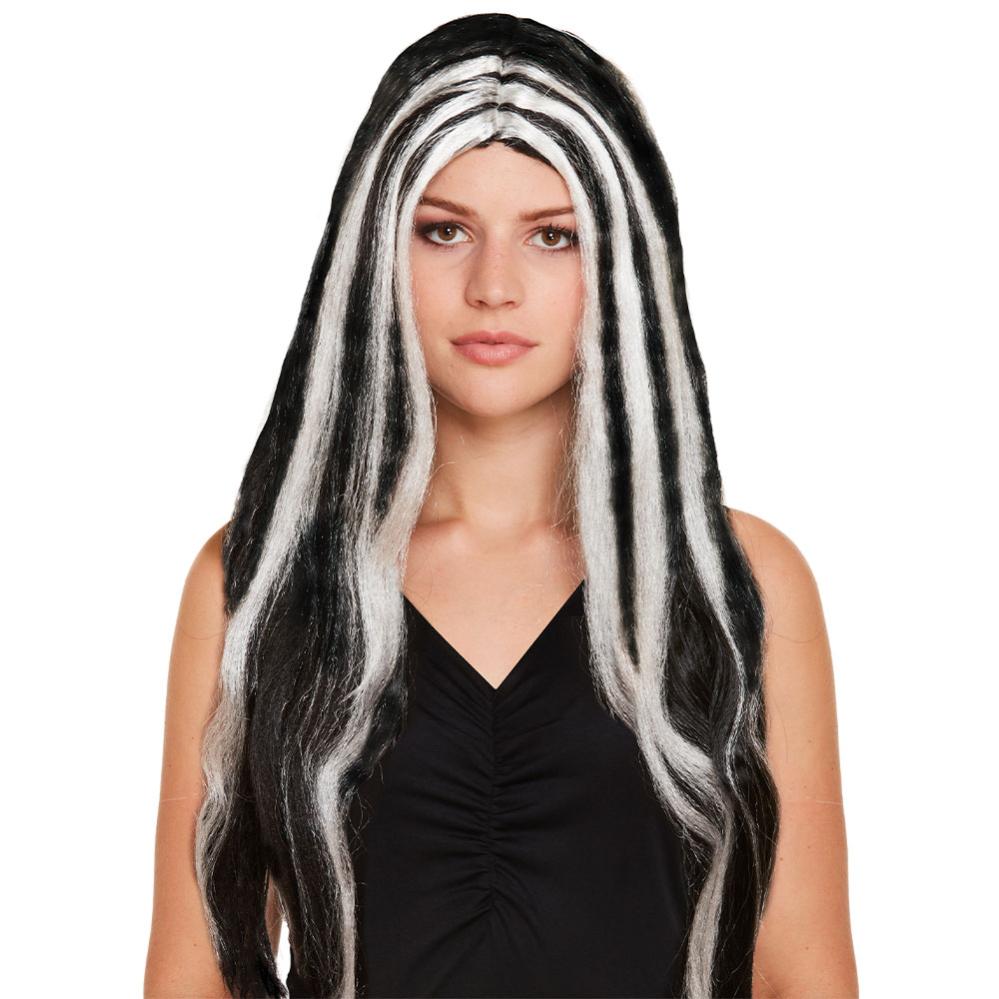 Viimeistele tyylisi pitkällä mustalla peruukilla, joka kruunaa jokaiset Halloween-naamiaiset. Tämä noitaperuukki, jossa on harmaanvalkoiset raidat ja keskijakaus, antaa tyyliisi mystisen vivahteen. Se on täydellinen kaikille, jotka etsivät dramaattista halloween-naamiaisperuukkia.