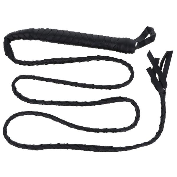 Pitkä Musta Ruoska 2 m sisältää pitkän naamiaisruoskan, joka on valmistettu mustasta nahkaa muistuttavasta punotusta materiaalista.