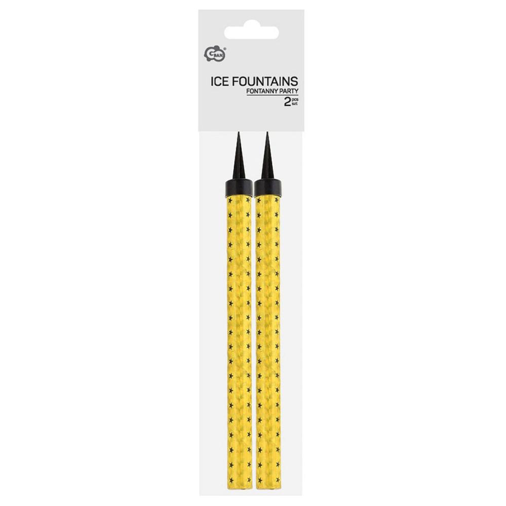 Pitkät Hohtavat Jääsoihdut Kulta 2-kpl sisältää 2 kpl pitkiä jääsoihtuja holografisesti hohtavassa kullanvärissä ja koristeellisella mustalla tähtikuviolla. Jääsoihduissa on myös alareunassa musta muovikärki, jonka ansiosta ne on helppo painaa esimerkiksi kakkuun tai jälkiruokaan.