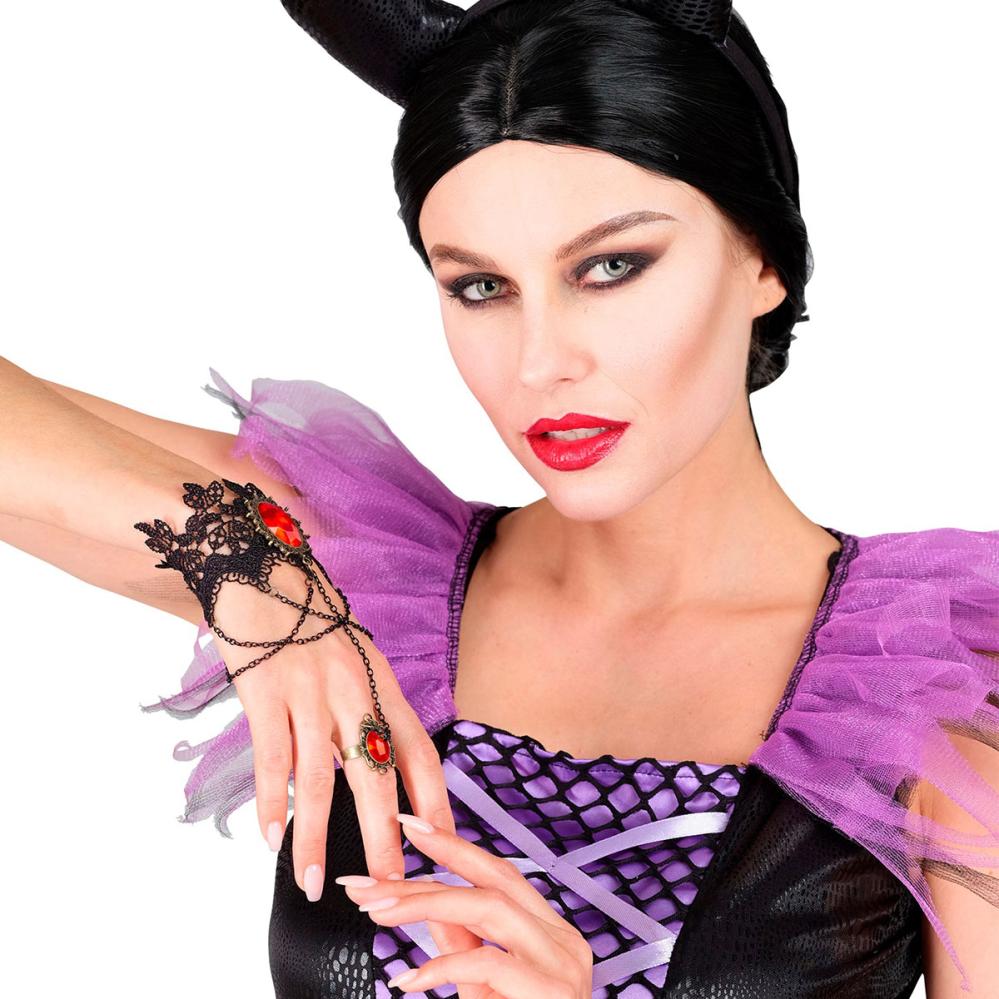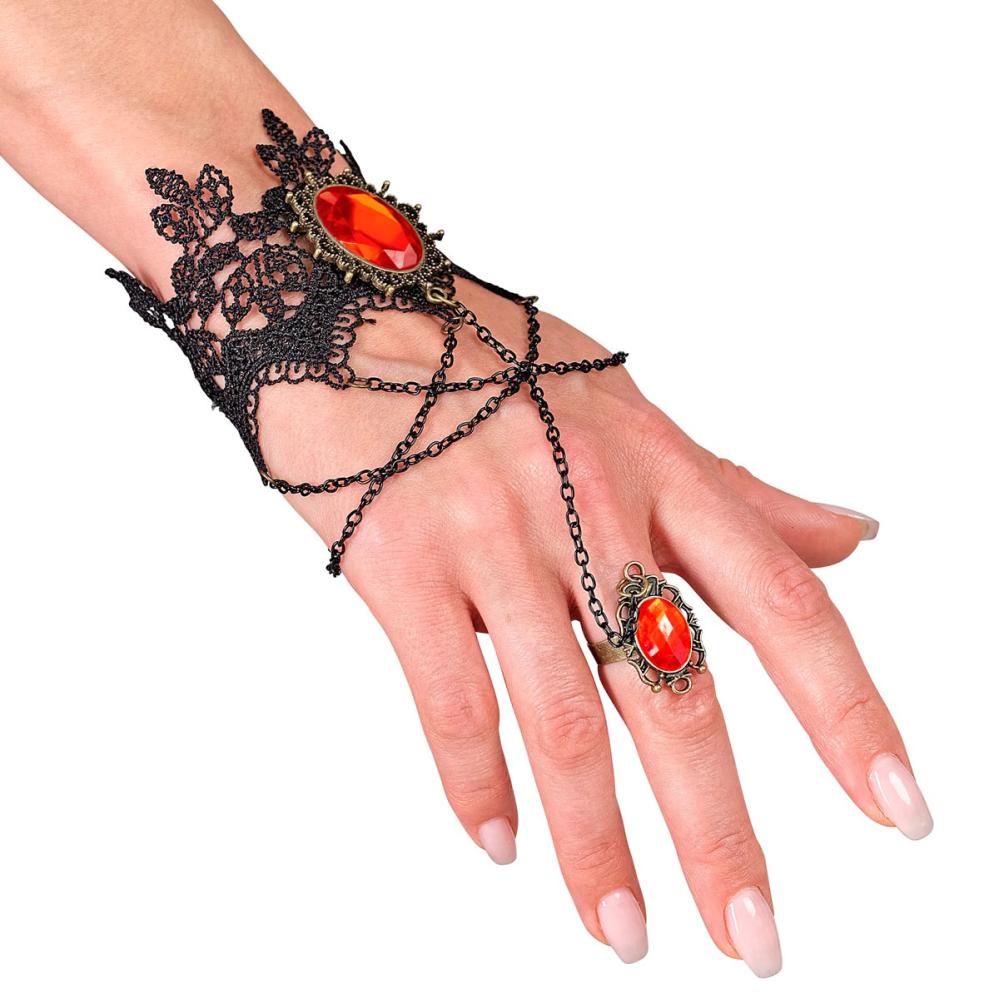 Naamiaisia ja halloweenia varten sopii rannekoru, mieluiten koristeellisella sormuksella, joka korostaa asuasi ja tuntuu miellyttävältä ranteessa. Tämä pitsirannekoru on pehmeä, säädettävä ja mukava pitkäaikaiseen käyttöyn illan aikana.
