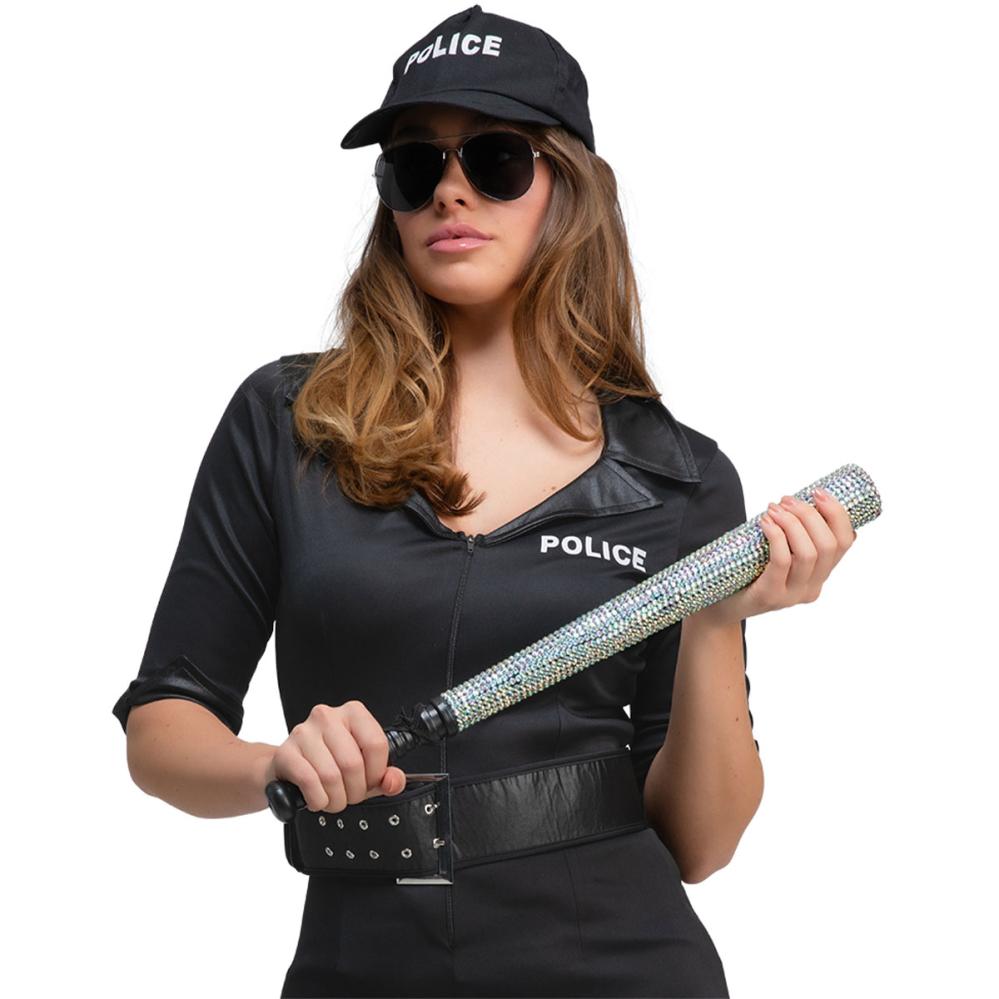 Poliisipamppu Strassilla sisältää poliisipampun, jossa on irisoivat strassit, musta kahva ja musta rannenauha.