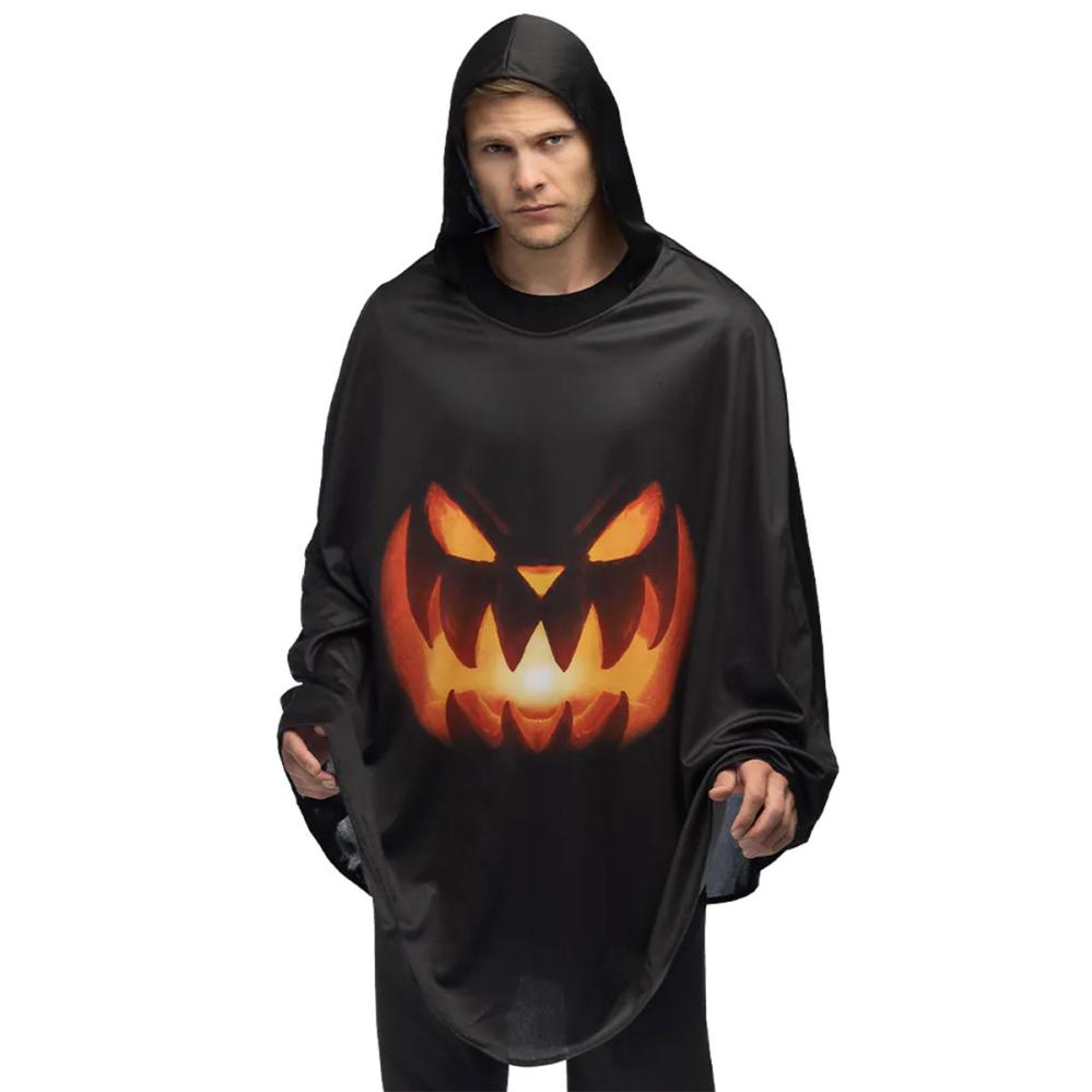 Poncho Hupulla Halloween-kurpitsa sisältää mustan hupullisen ponchon, jota koristaa halloween-kurpitsa.