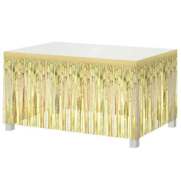 Pöytähame Hapsuilla Vaalea Kulta on pöytähame, jossa on kimmeltävät hapsut vaalean kullan sävyssä.