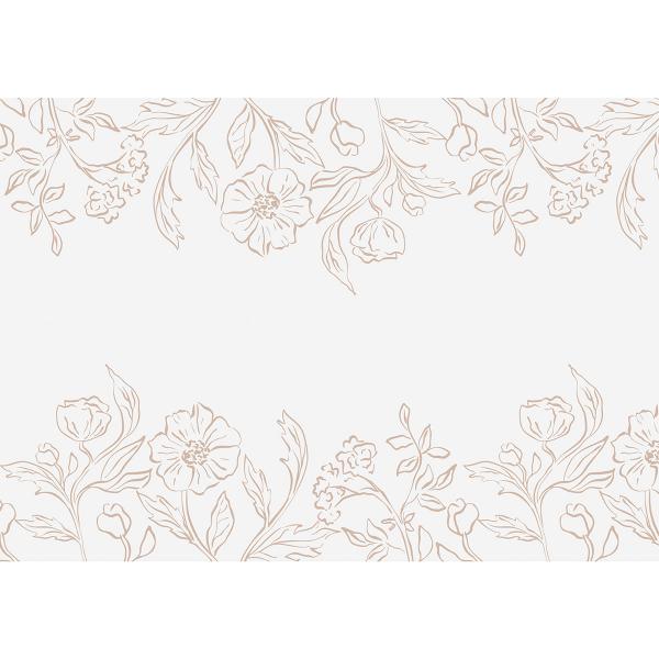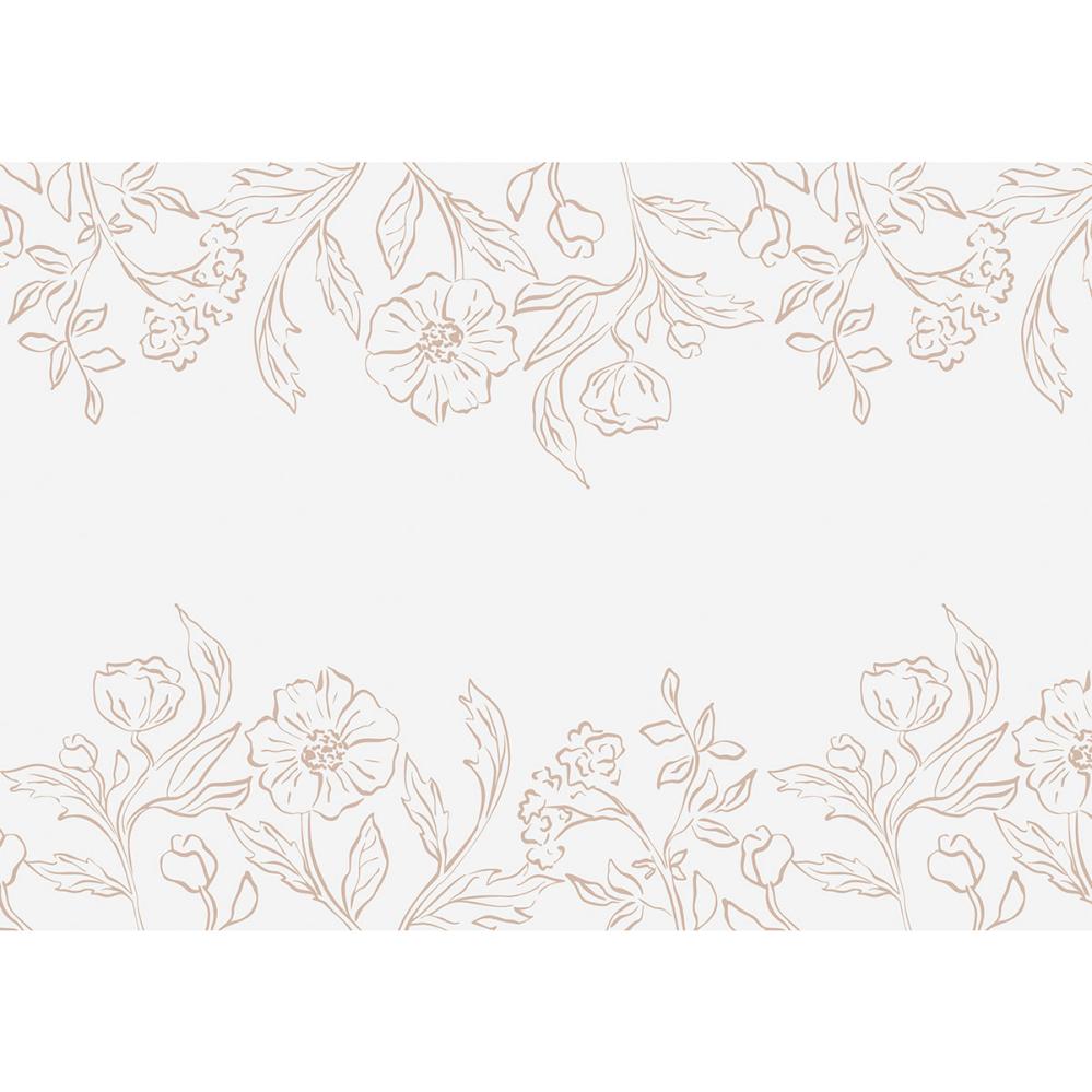 Pöytäjuoksija Kukkakuviolla 40 x 500 cm sisältää rullan valkoista liinaa, joka on koristeltu kauniilla beigellä kukkakuviolla. Pöytäjuoksija on valmistettu kuitukangaspaperista (airlaid nonwoven), mikä tekee siitä pehmeän, kestävän ja imukykyisen sekä antaa sille kankaanomaisen tunnun.