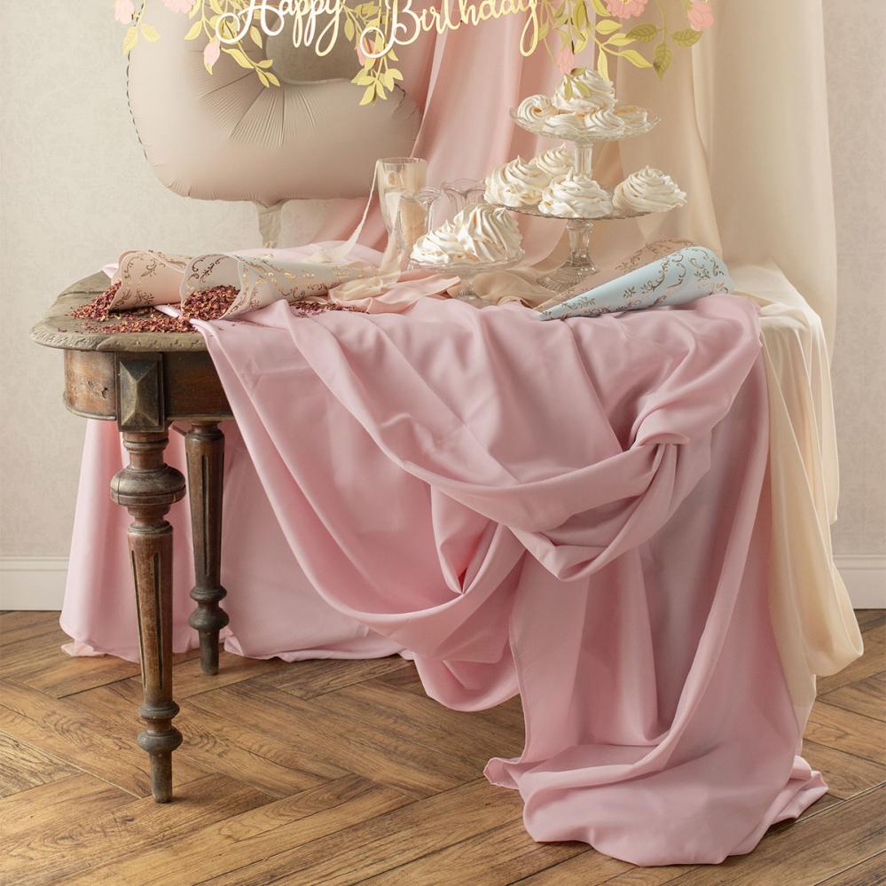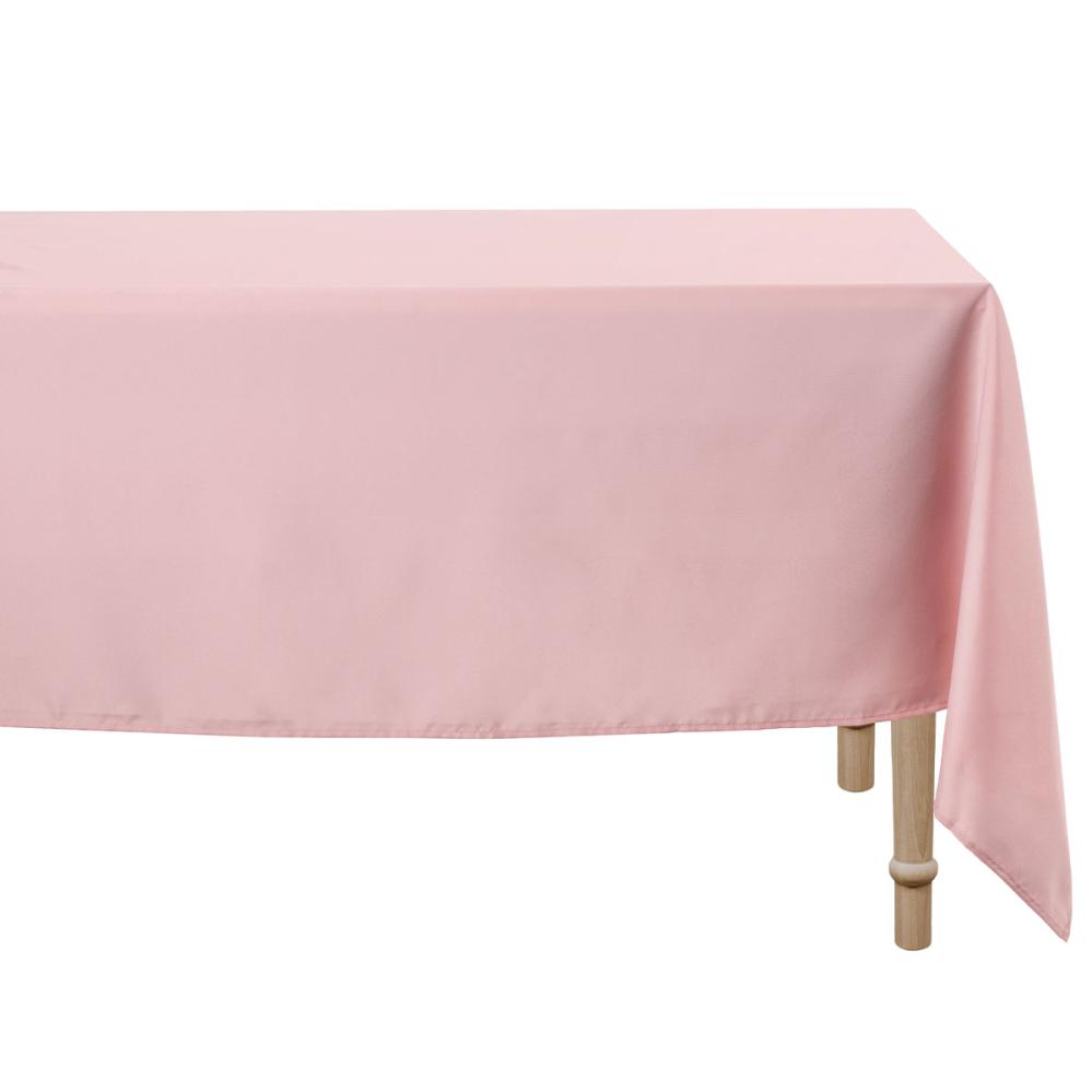 Vauvakutsuille sopii kattaukseen täydellisesti suorakulmainen vaaleanpunainen pöytäliina, sillä se luo pehmeän ja juhlavan tunnelman. Vanharoosan sävy tuo pöytään lämpimän ja kutsuvan tunnelman.