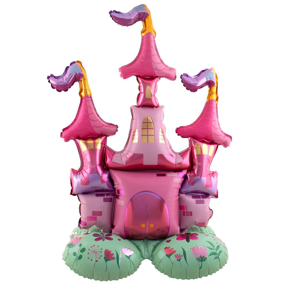 Prinsessalinna Seisova Folioilmapall 65 x 90 cm on itsestään seisova prinsessalinnan muotoinen folioilmapallo. Linna on vaaleanpunainen ja seisoo vihreällä nurmialustalla, jossa on erilaisia kukkia. Ilmapallo täytetään ilmalla mukana tulevan puhallusputken avulla.